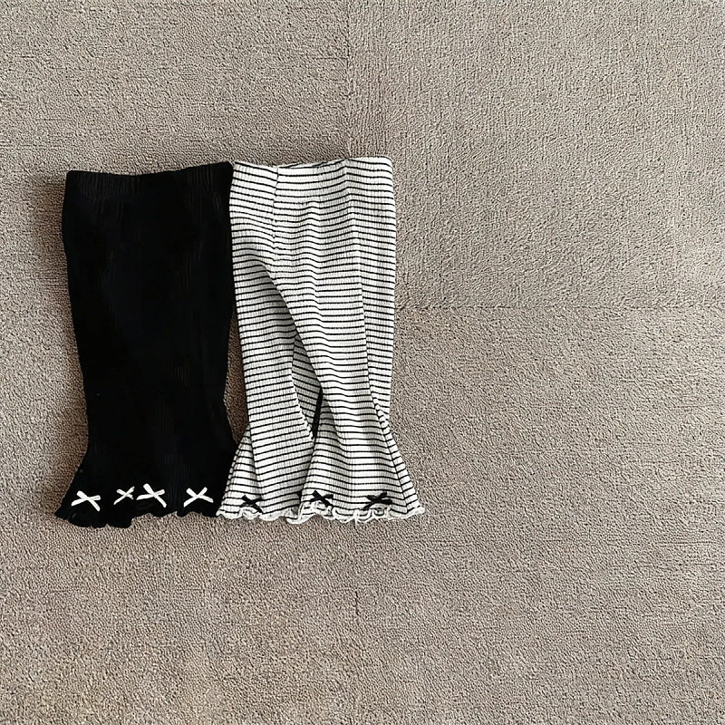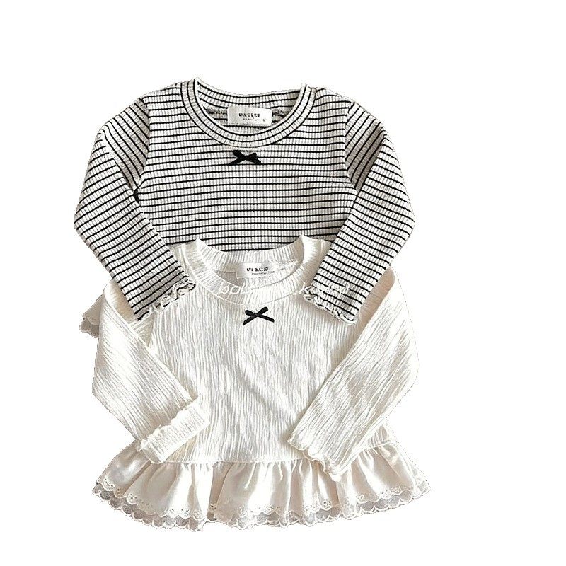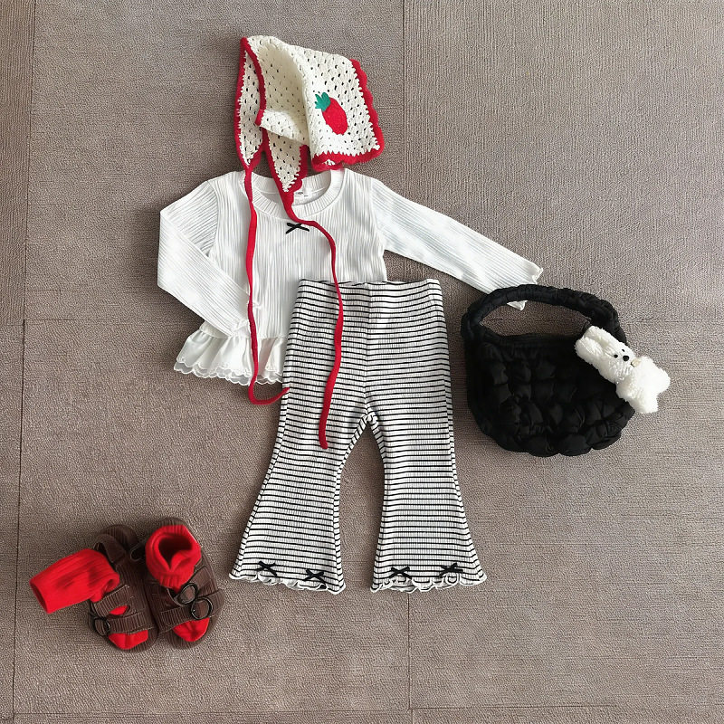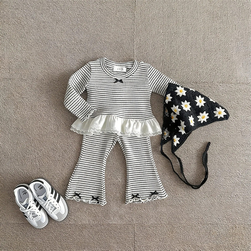 韩版新款童装2025春秋季女宝宝可爱花边拼接条纹T恤衫喇叭裤套装