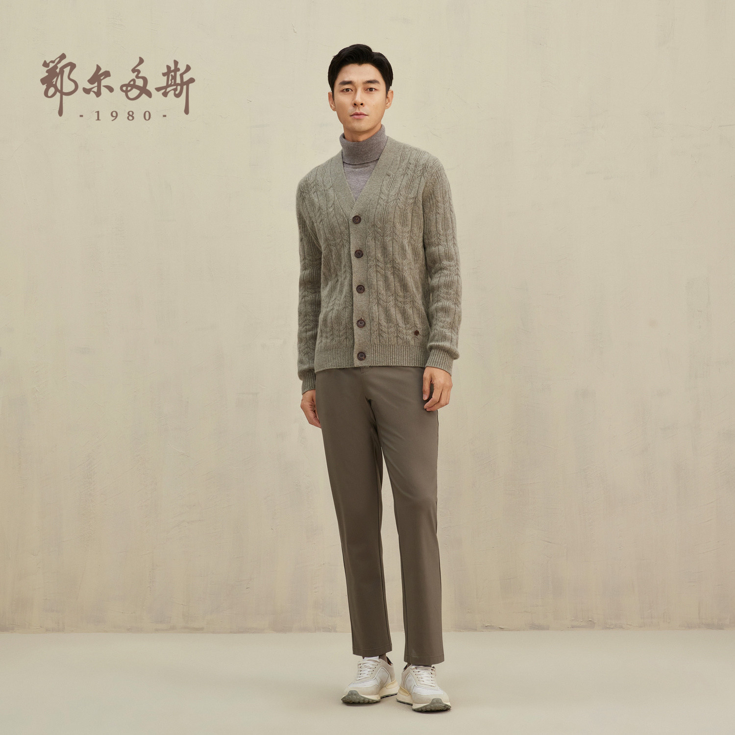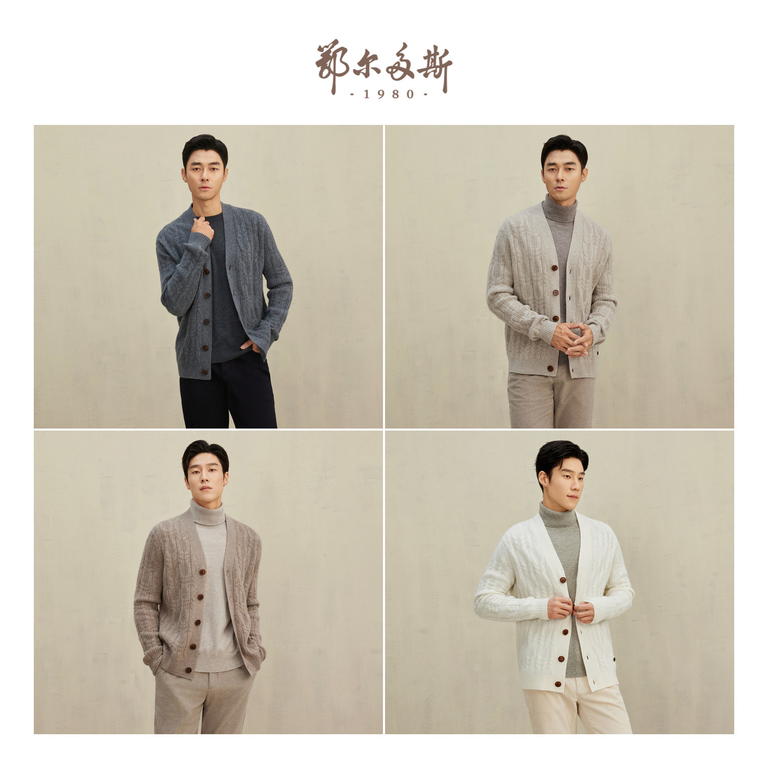 鄂尔多斯1980 V领绞花羊绒开衫秋冬厚款纯色复古针织衫男