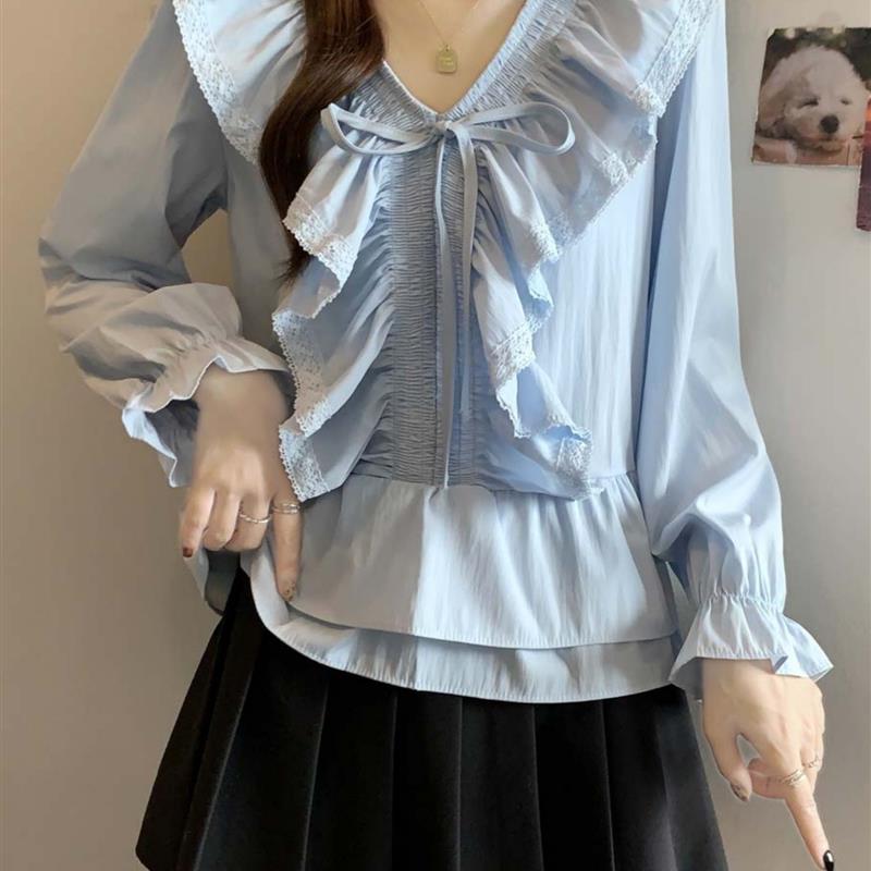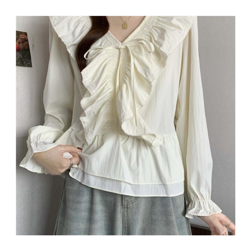 好货荷叶边V领长袖打底衬衫女春秋2025大码胖mm显瘦法式短款漂亮