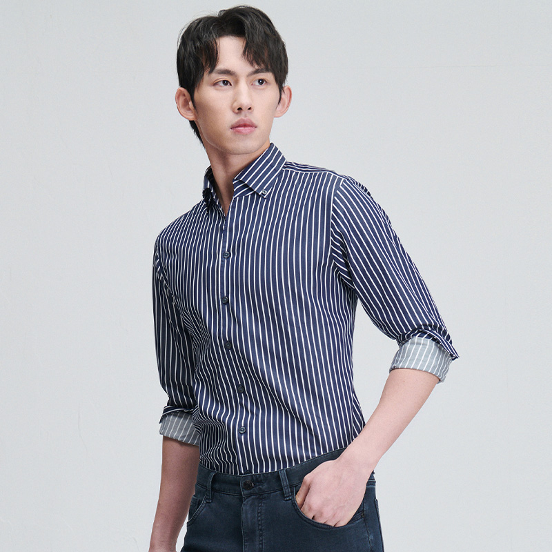 报喜鸟春季新款男士商务正装长袖衬衫时尚打底衬衣简约上衣牛仔蓝