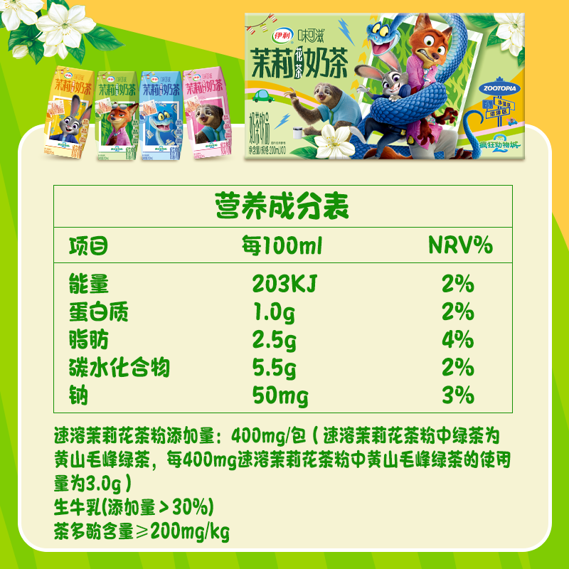 【疯狂动物城装】伊利官方旗舰店味可滋茉莉花茶奶茶200ml*10盒