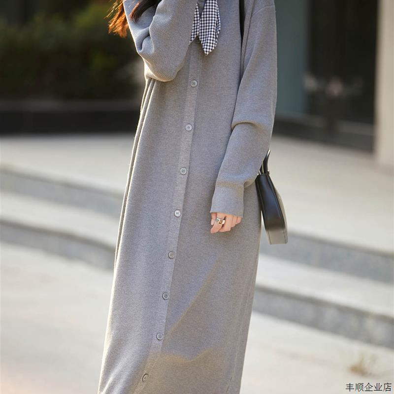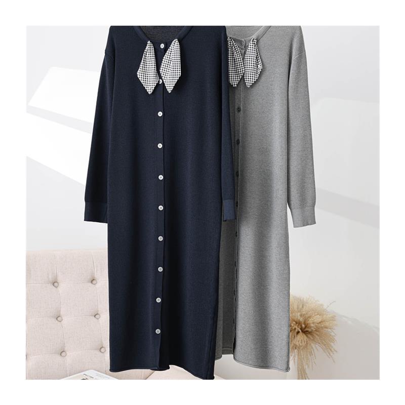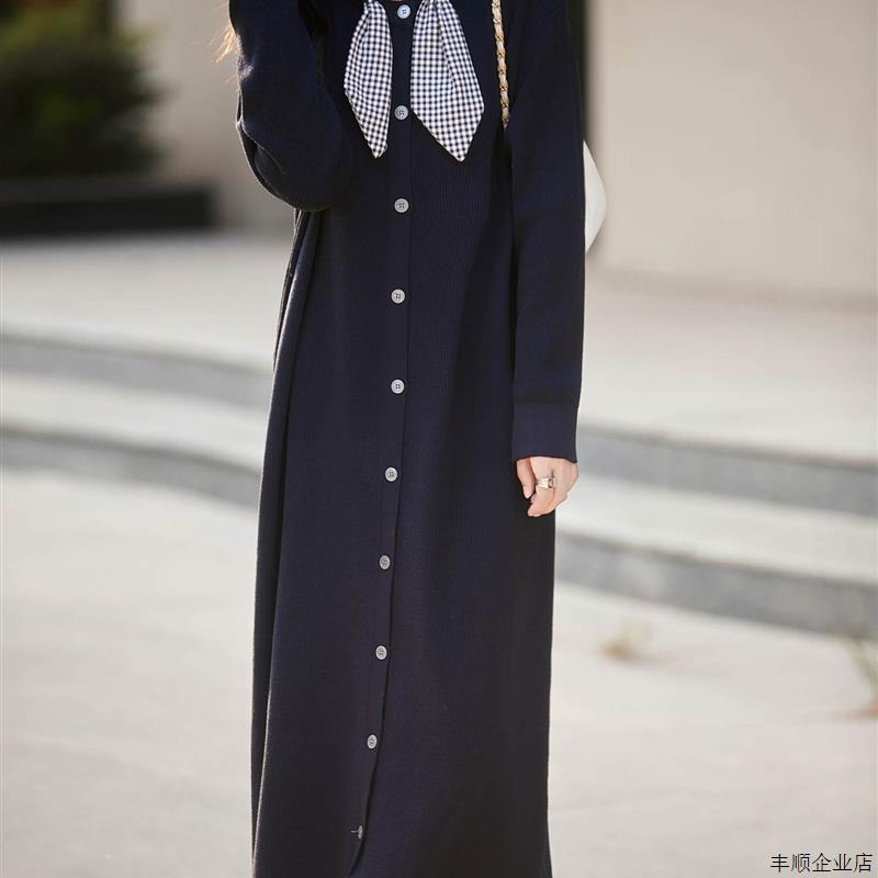 法式飘带领针织连衣裙女亲肤精纺丝绵直筒宽松显瘦毛衣裙过膝长裙