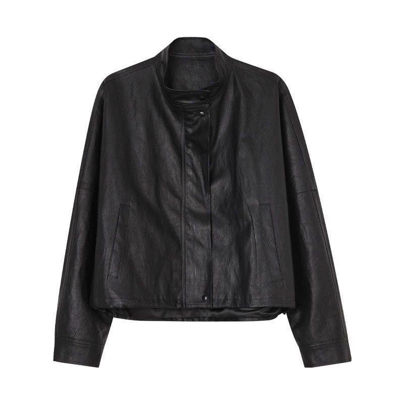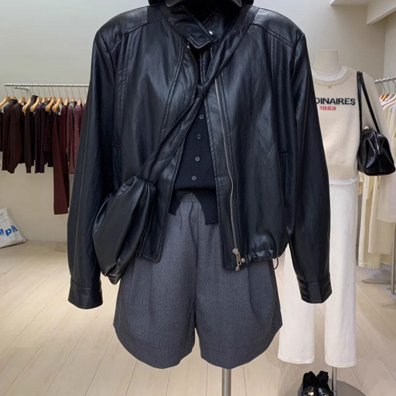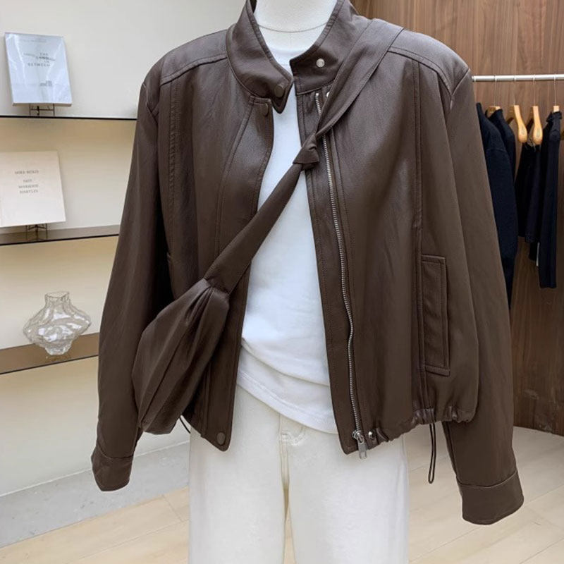 立领皮衣外套女2025秋两色休闲下摆抽绳收腰显瘦宽松短款夹克外套