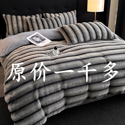冬季高端兔毛绒四件套加厚牛奶绒珊瑚绒双面绒条纹被套床单床笠款
