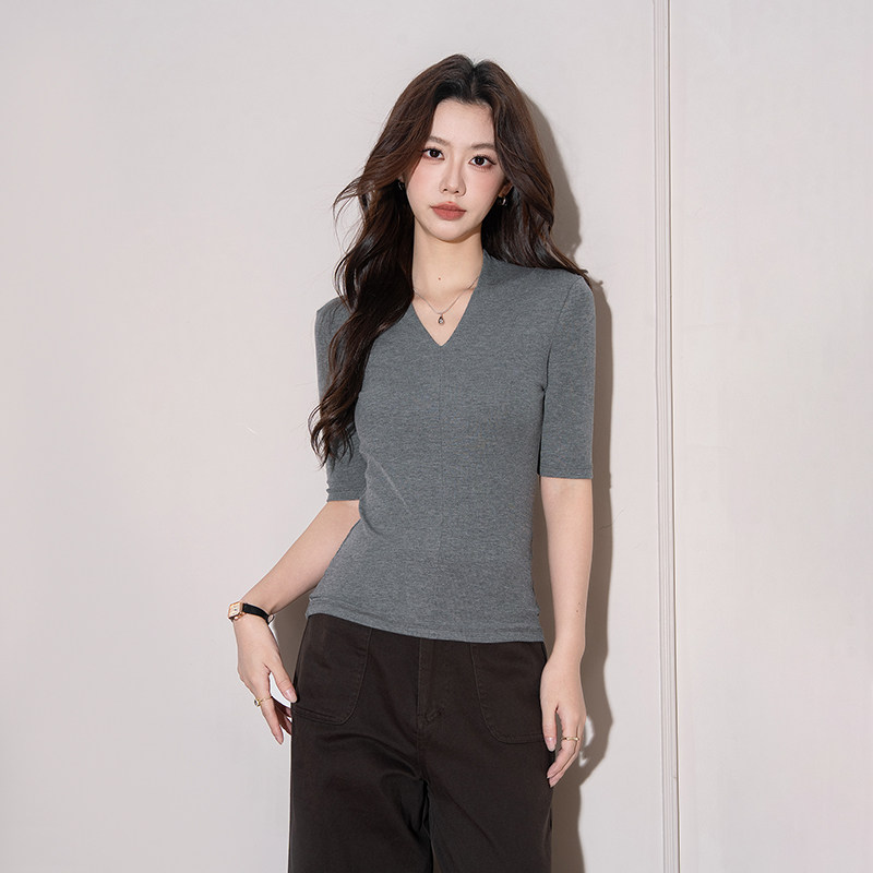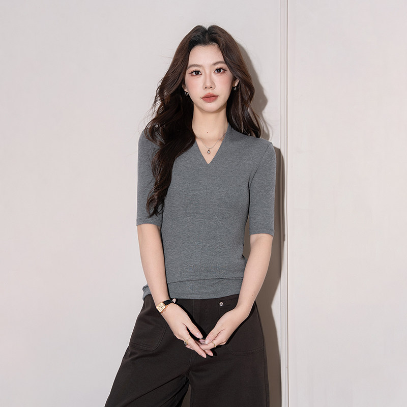 螺纹v领中袖t恤女春夏季内搭