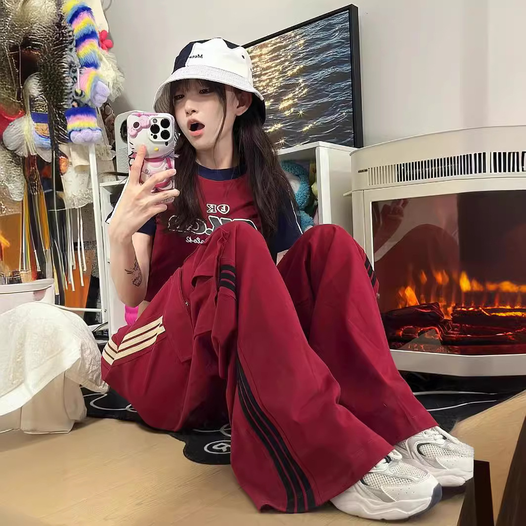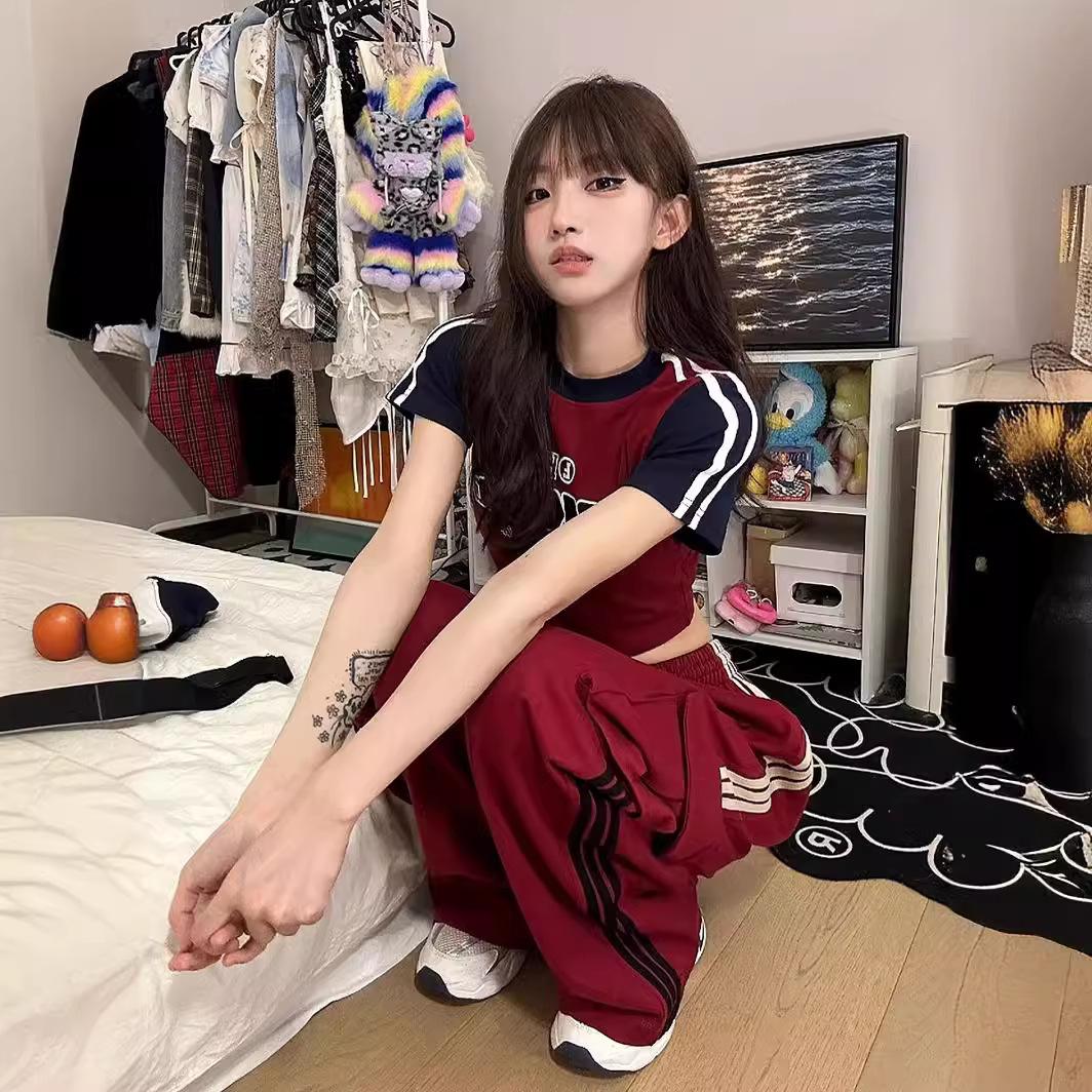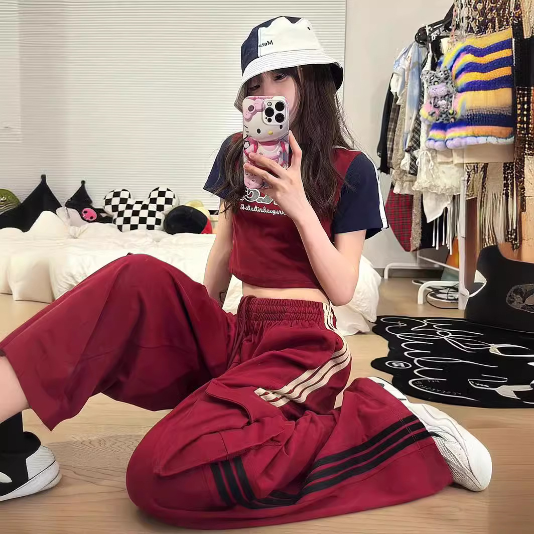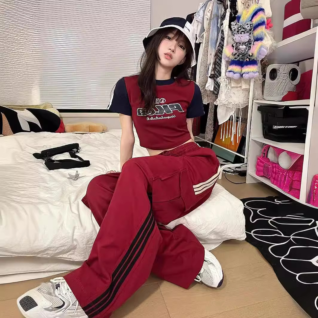 美式炸街运动服套装女夏季甜酷辣妹时尚短袖工装阔腿裤休闲两件套