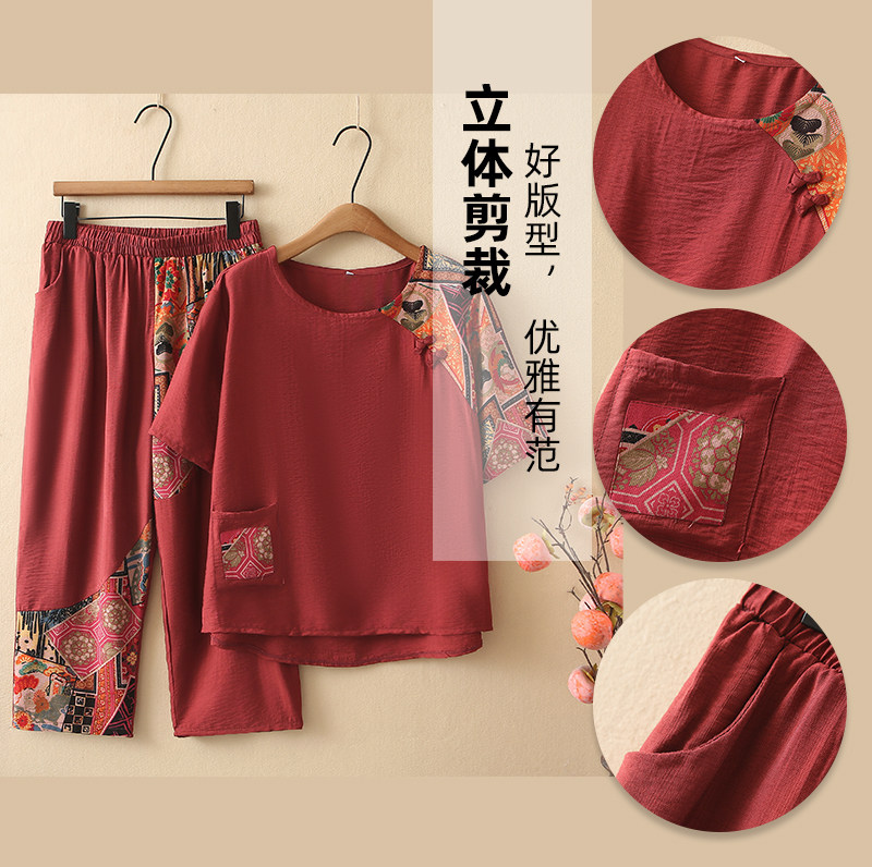 胖妈妈夏装套装冰丝棉麻加大码洋气薄款中老年两件套女装短袖上衣