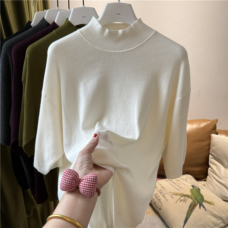 2025新款羊毛半高领中袖针织衫时尚秋季中袖薄针织衫打底衫五分袖