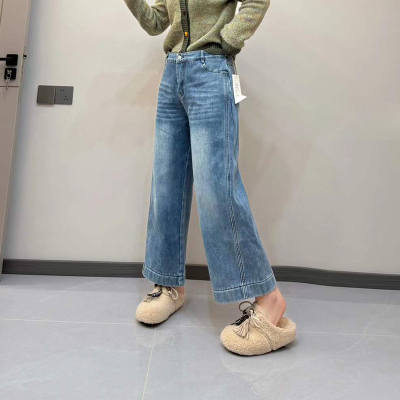 加肥后腰松紧腰加绒阔腿九分裤大码女装宽松遮胯简约秋冬款牛仔裤