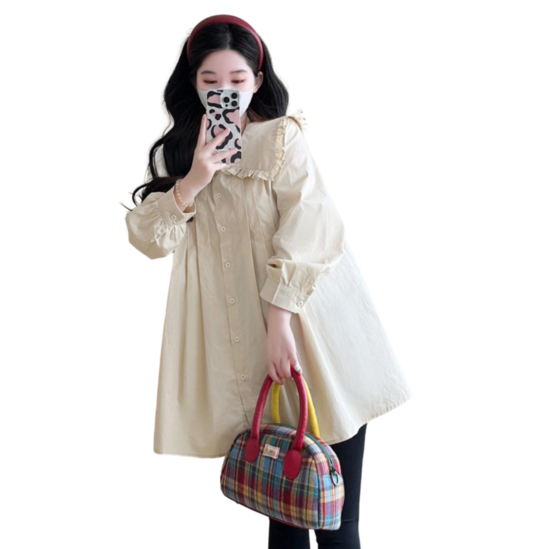 大码孕妇装春秋季新款长袖中长款衬衫宽松显瘦娃娃领上衣200斤潮