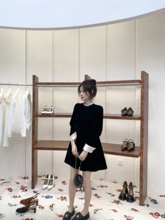 珍珍家法式气质挂珍珠撞色领口黑色丝绒连衣裙优雅氛围短款小黑裙