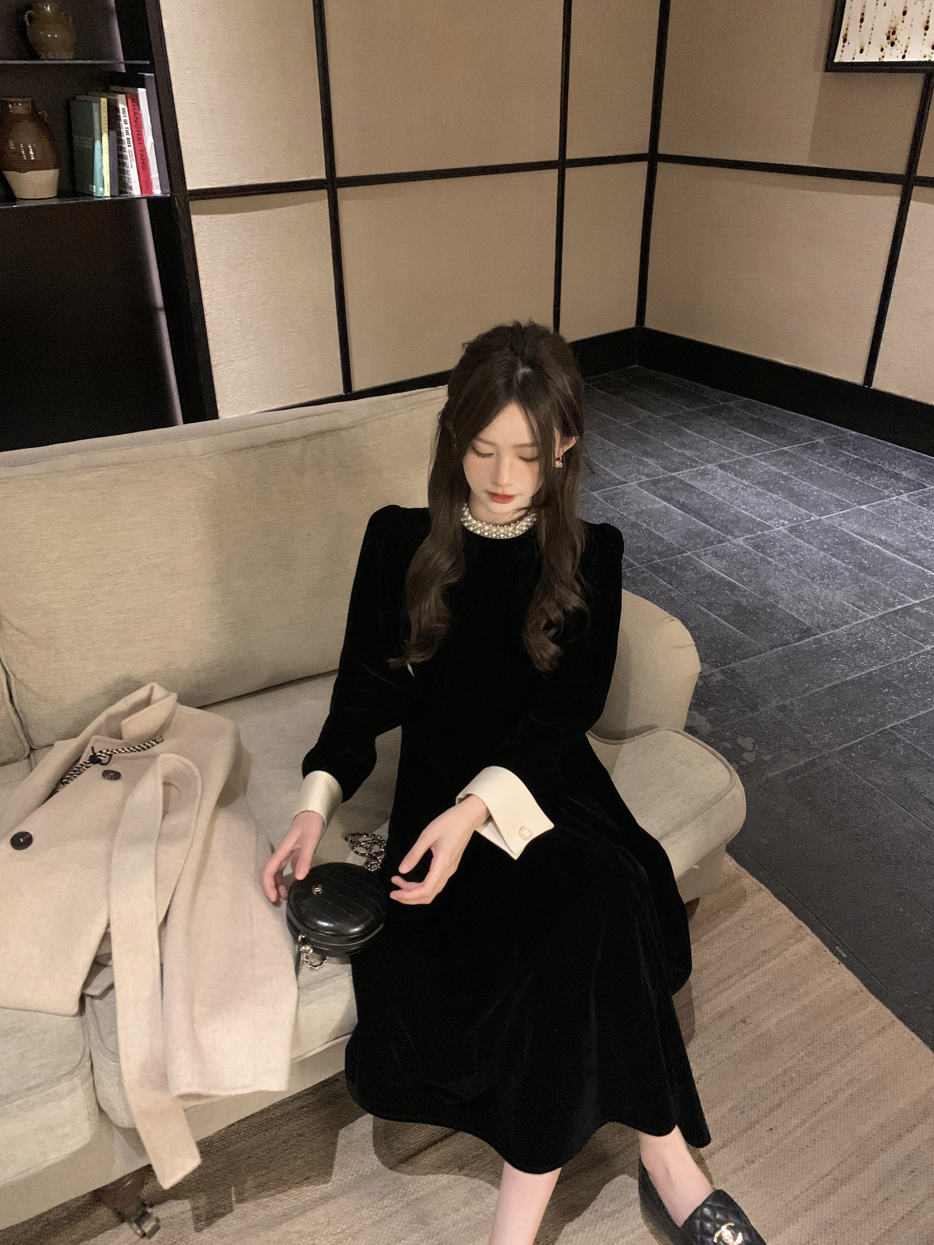 Zzhen珍珍家黑色丝绒长款连衣裙