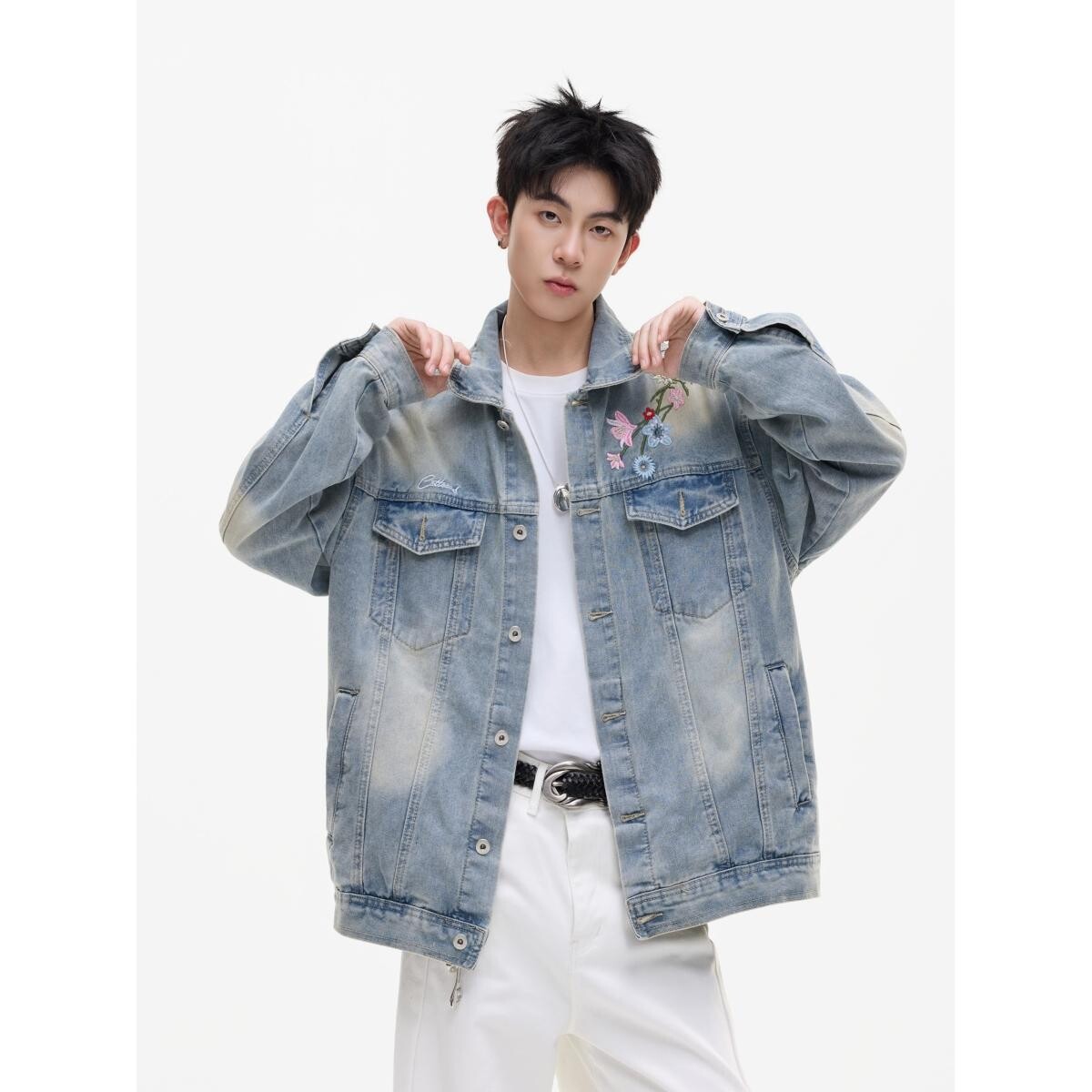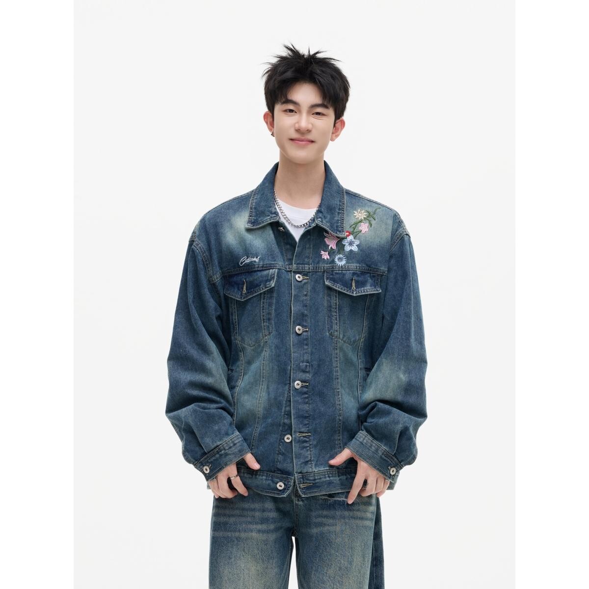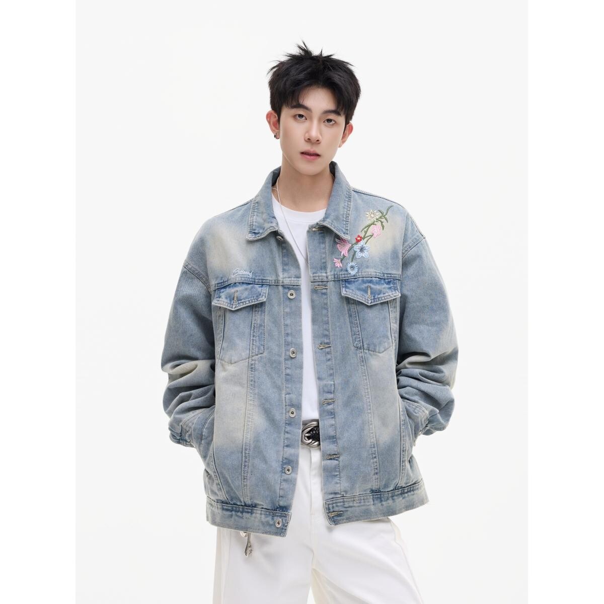 秋美式花卉刺绣水洗廓形宽松翻领牛仔衣夹克情侣外套
