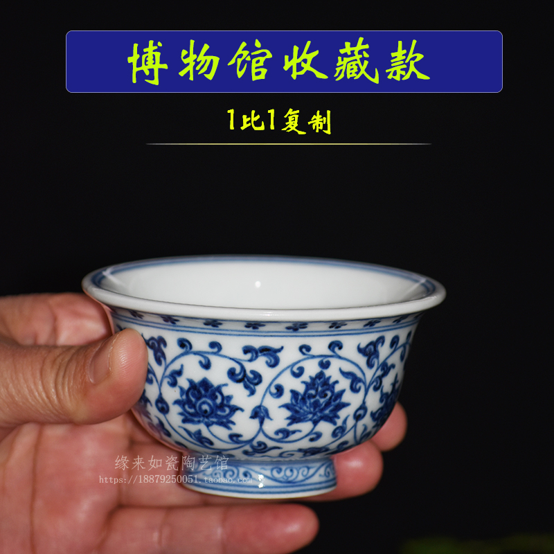 主人杯手绘缠枝j莲青花瓷景德镇手工功夫茶杯双狮纹仿明永乐压手