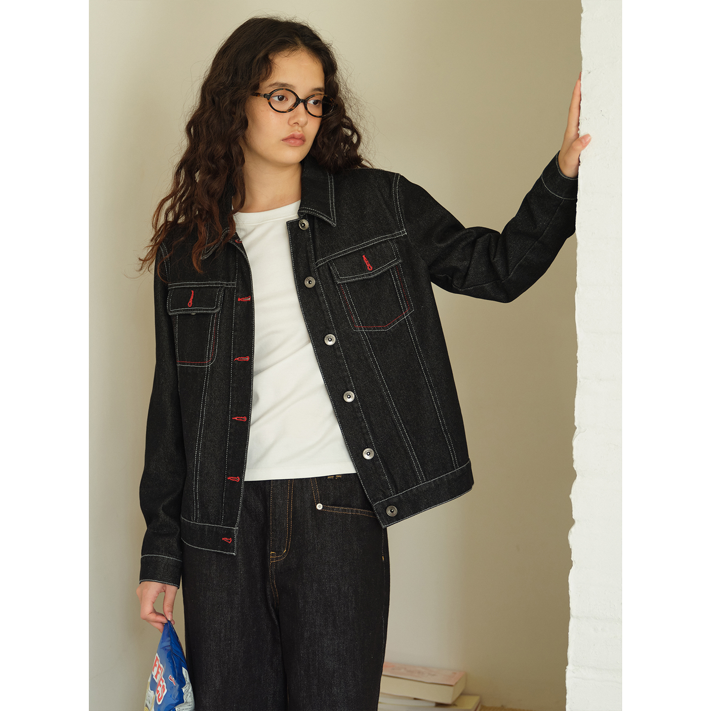 复古原色牛仔撞红线设计感外套
