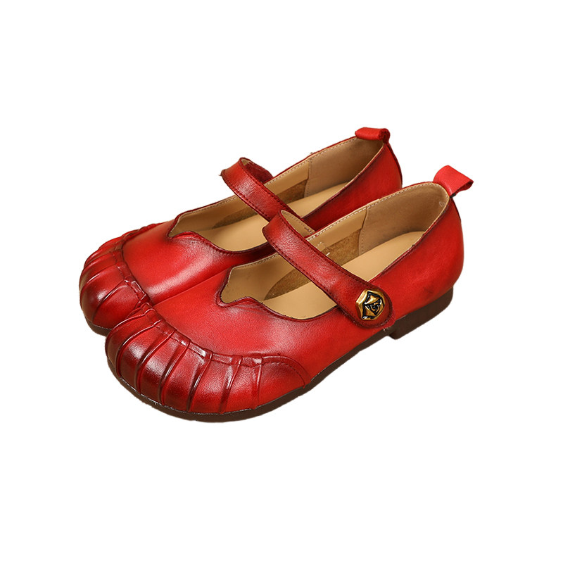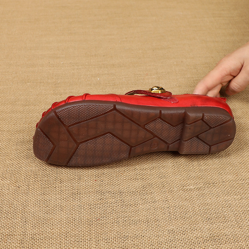 复古牛筋底平底单鞋女春季新款真皮软底舒适妈妈鞋红色中老年皮鞋