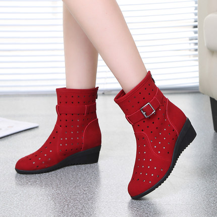 春秋新款女靴镂空短靴磨砂单靴坡跟软底洞洞女鞋休闲凉靴跳舞鞋子