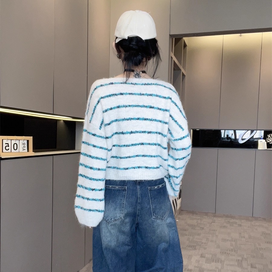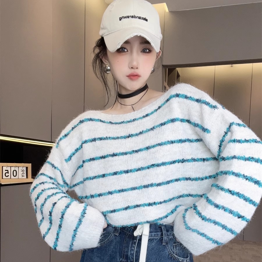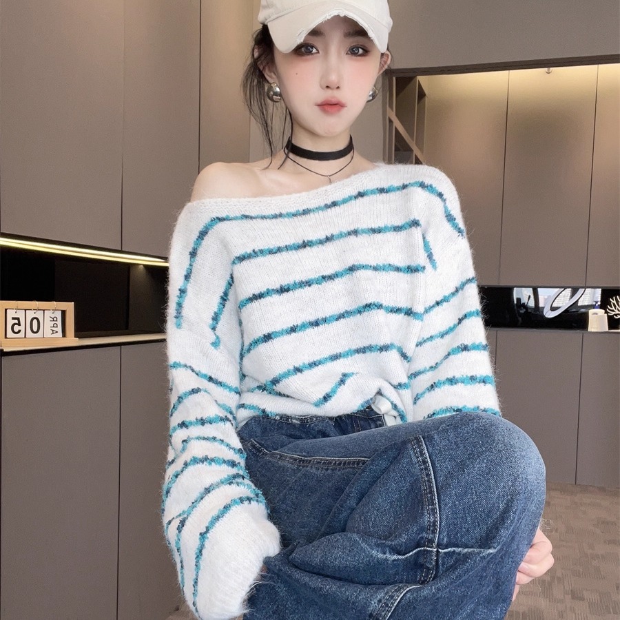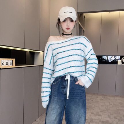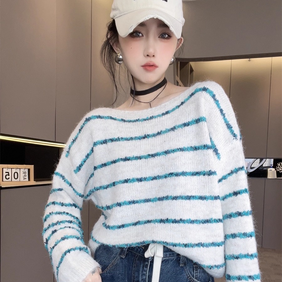 洋气欧货潮时髦上衣女款2025新款秋季一字领套头条纹长袖针织毛衣