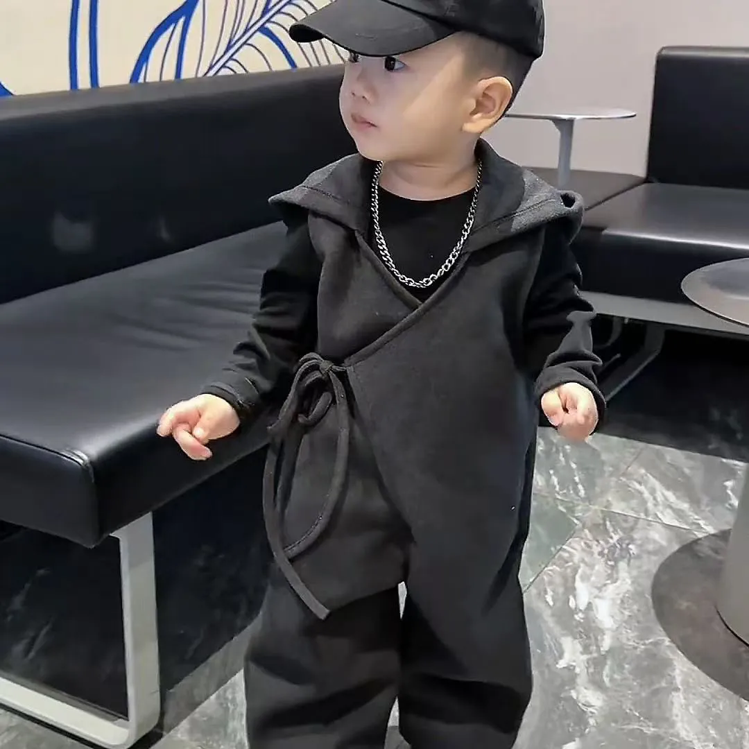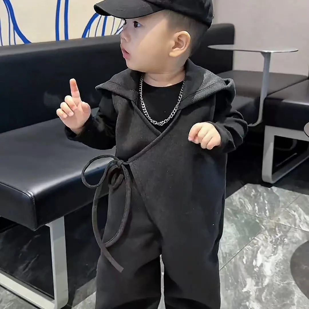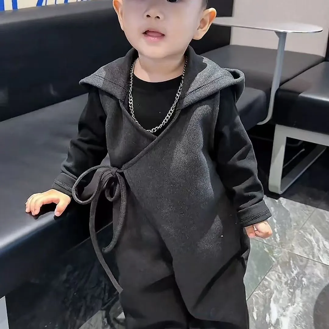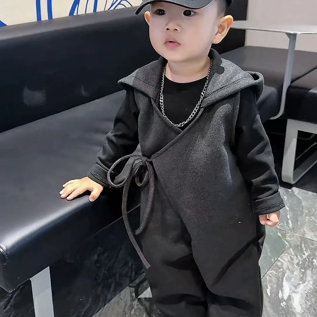 男女童春秋装新款连体裤童装儿童洋气宝宝黑色连帽连体衣打底衫潮