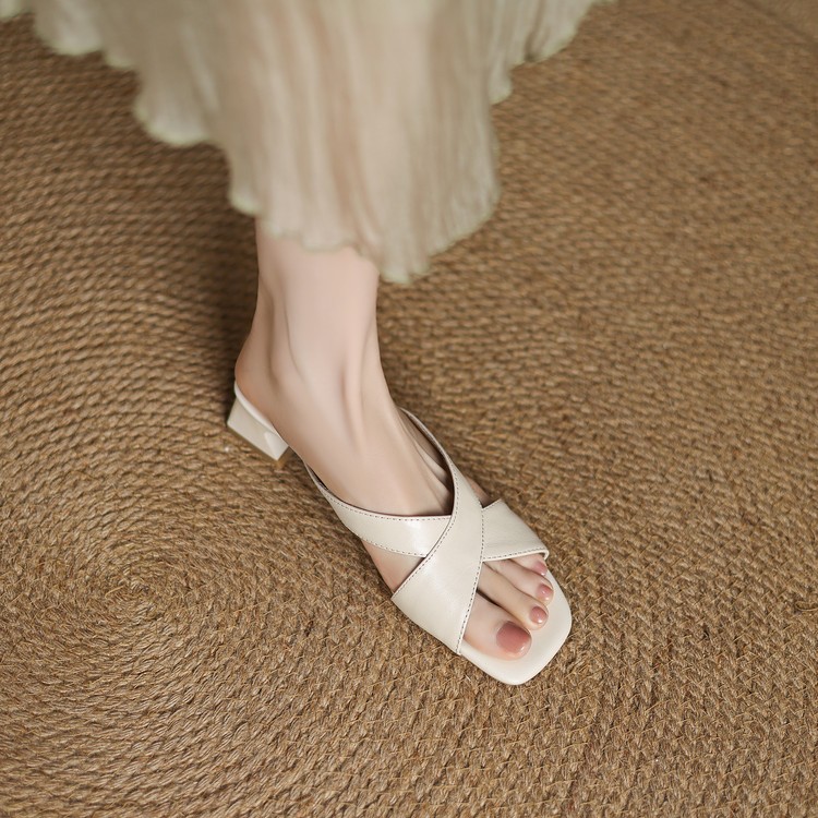 诗宝斐尔 粗跟4CM法式交叉带露趾凉拖鞋女夏真皮时尚方头中跟凉鞋