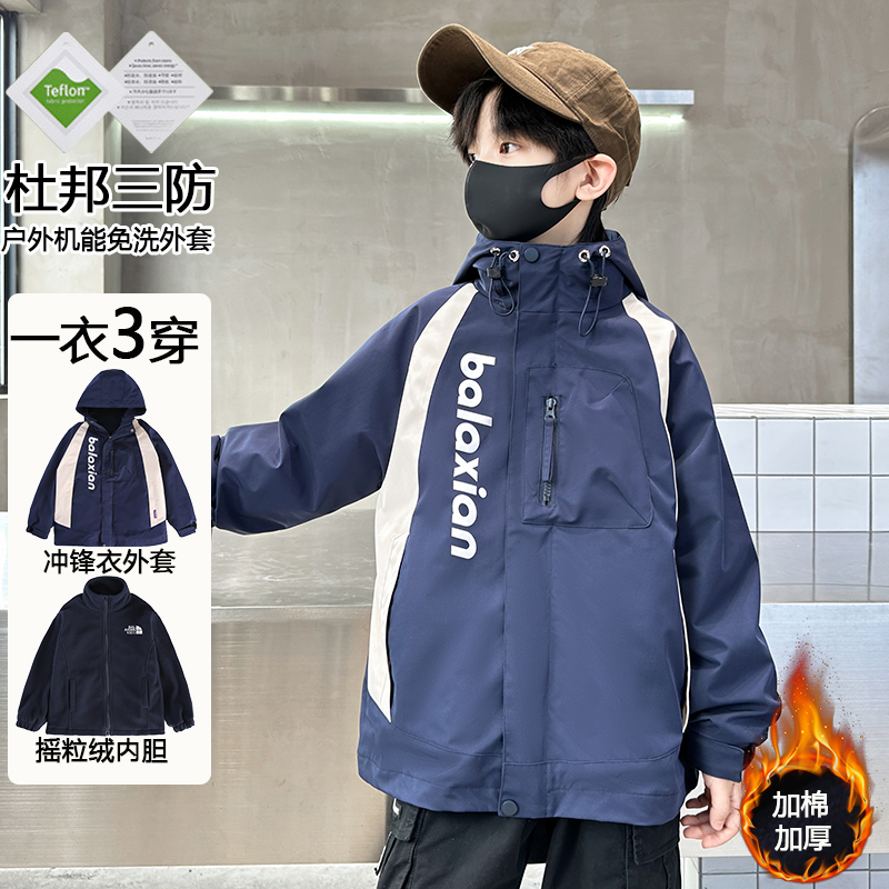 GILE男童冲锋衣三合一可拆卸儿童外套秋冬季加厚大童男孩羽绒棉服