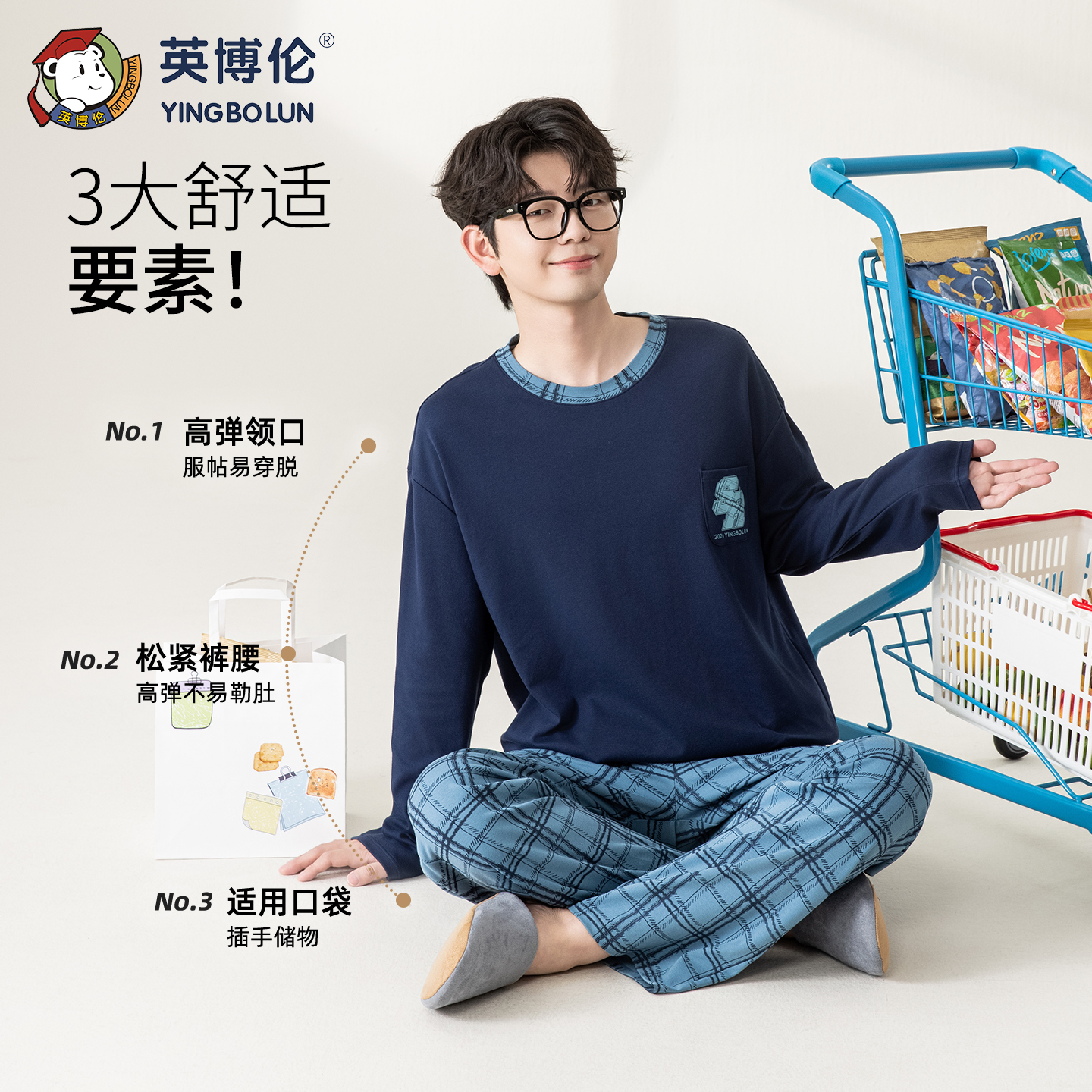 英博伦青少年家居服宽松长袖男大童2025春秋新款睡衣套装纯棉a类
