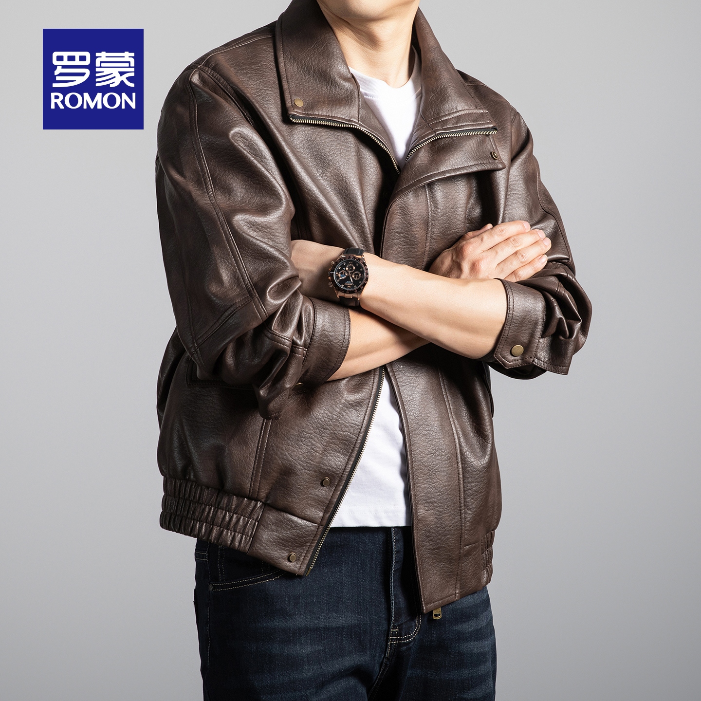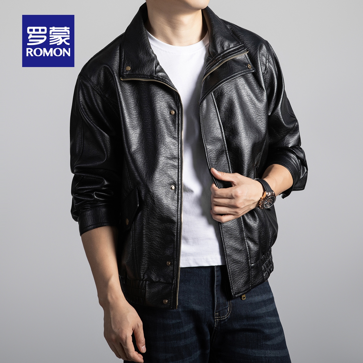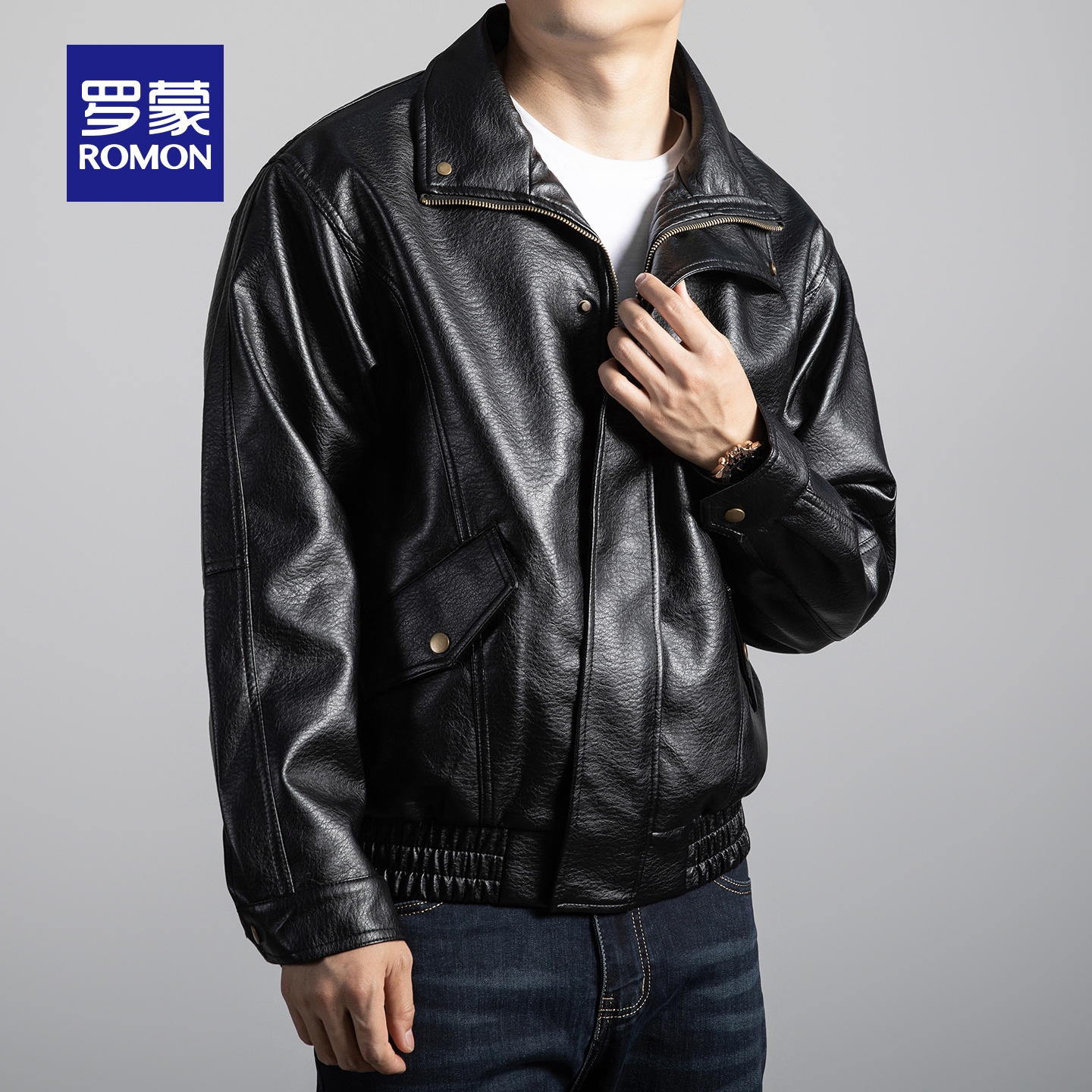 罗蒙男士户外潮流百搭翻领PU皮衣