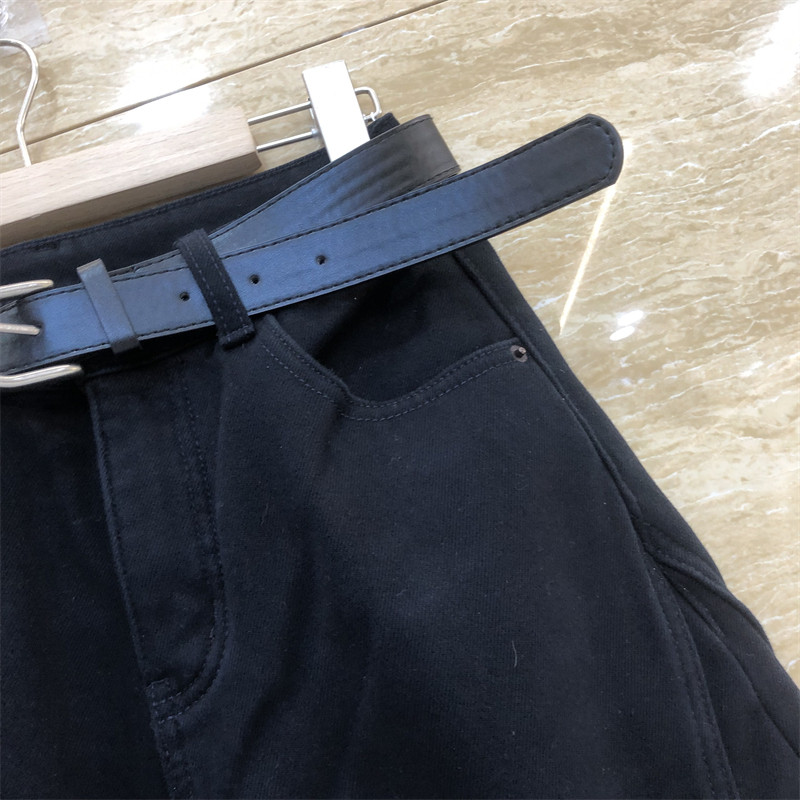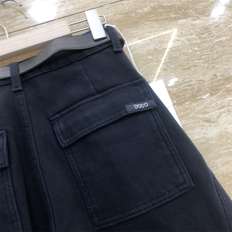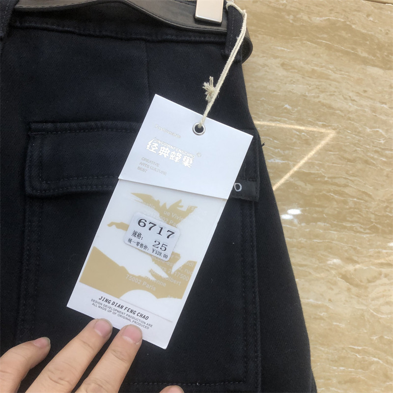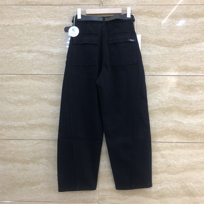 欧洲站经典蜂巢6717藏青色腰带弯刀字母刺绣阔腿宽松加绒牛仔裤女
