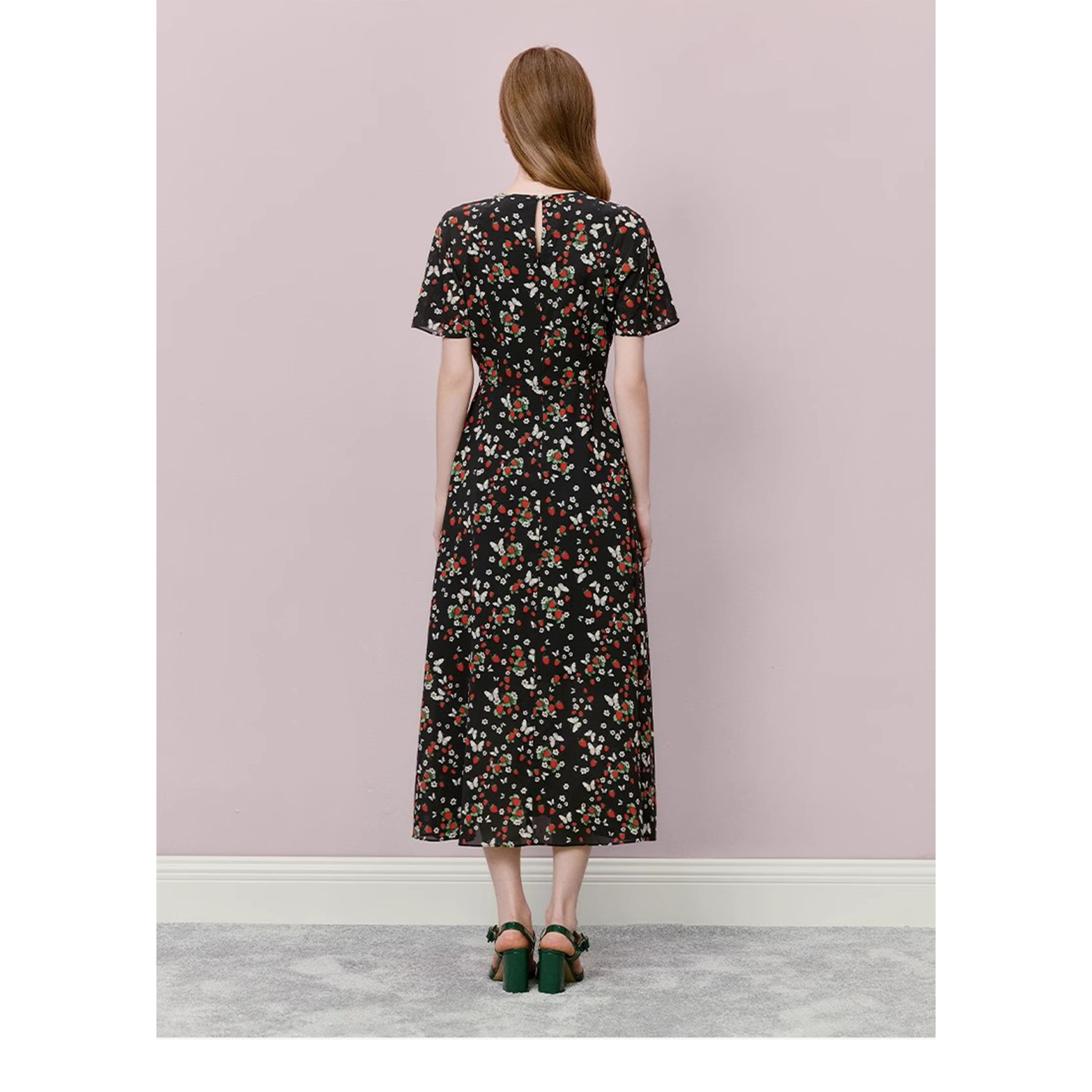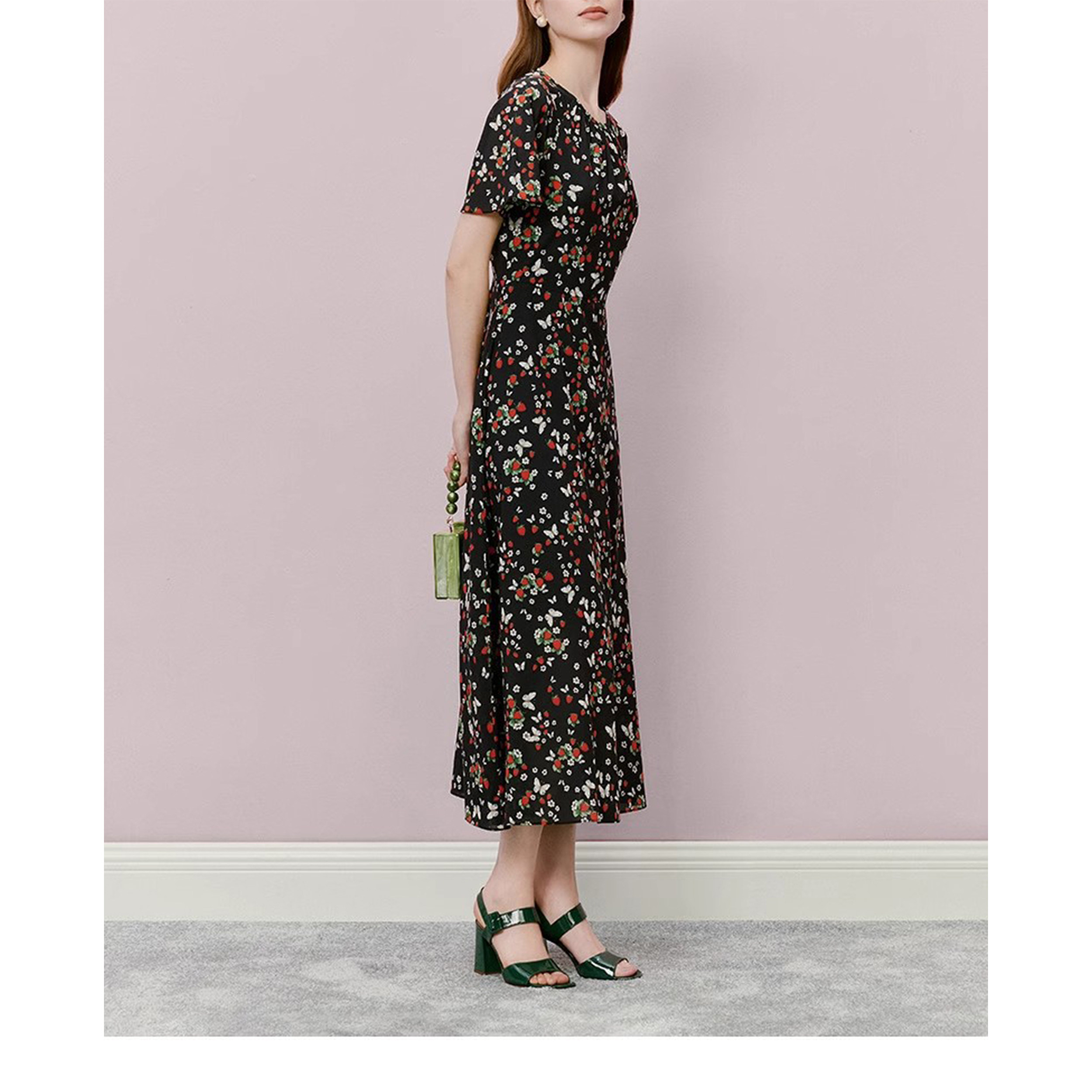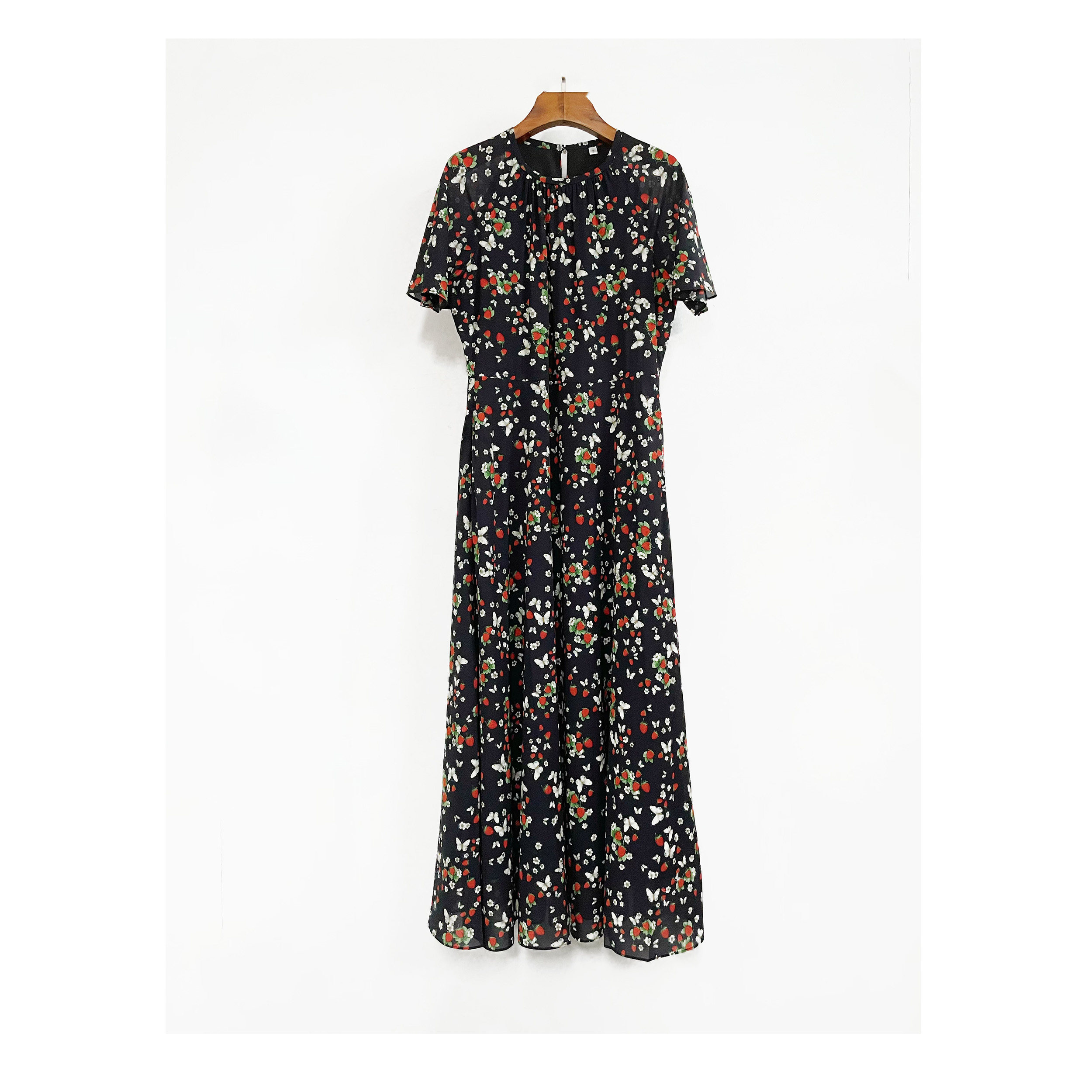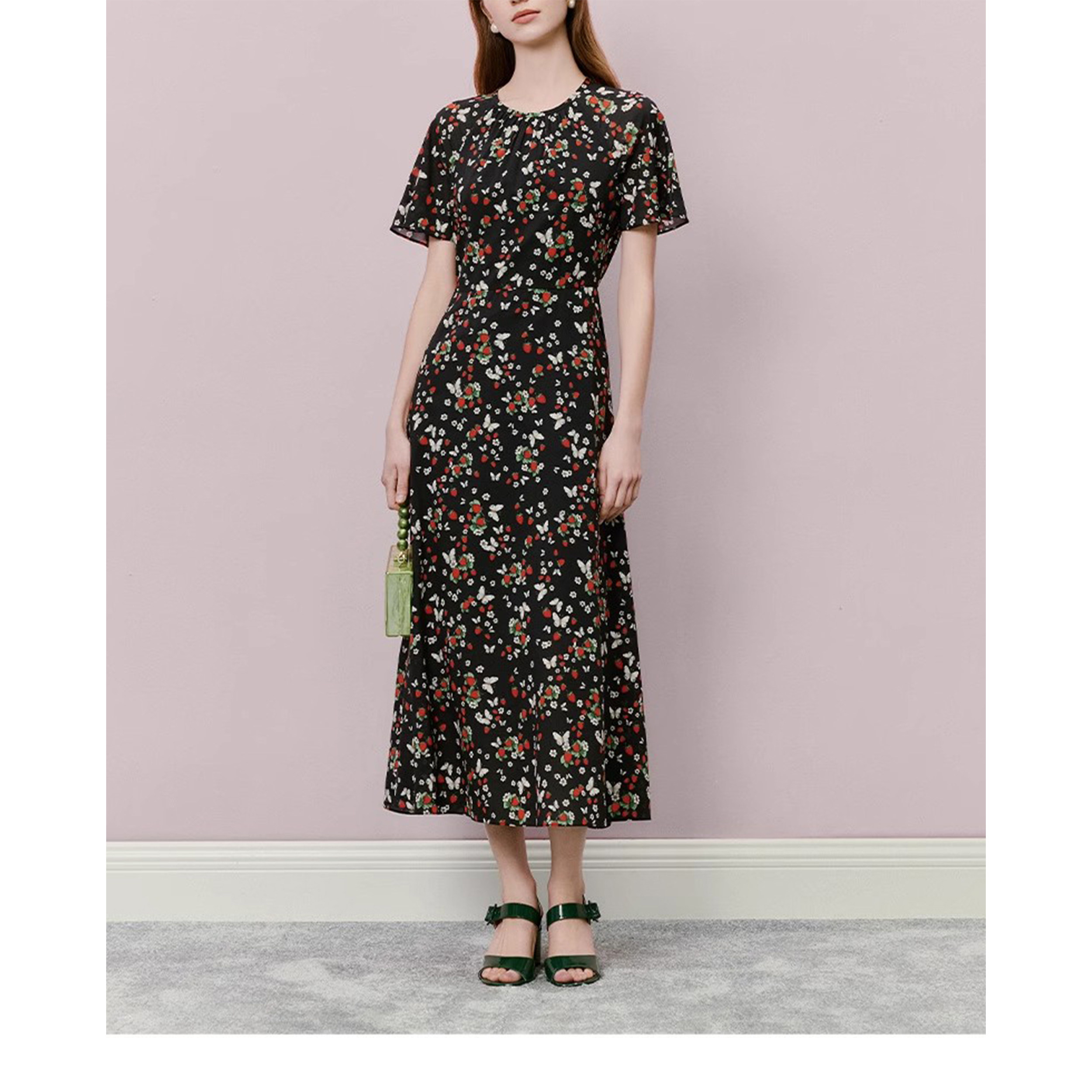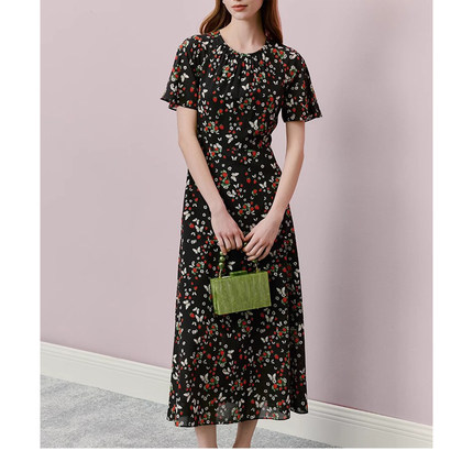 新品 元单 黑色印花真丝连衣裙 桑蚕丝长款圆领A摆 侧袋 法式优雅