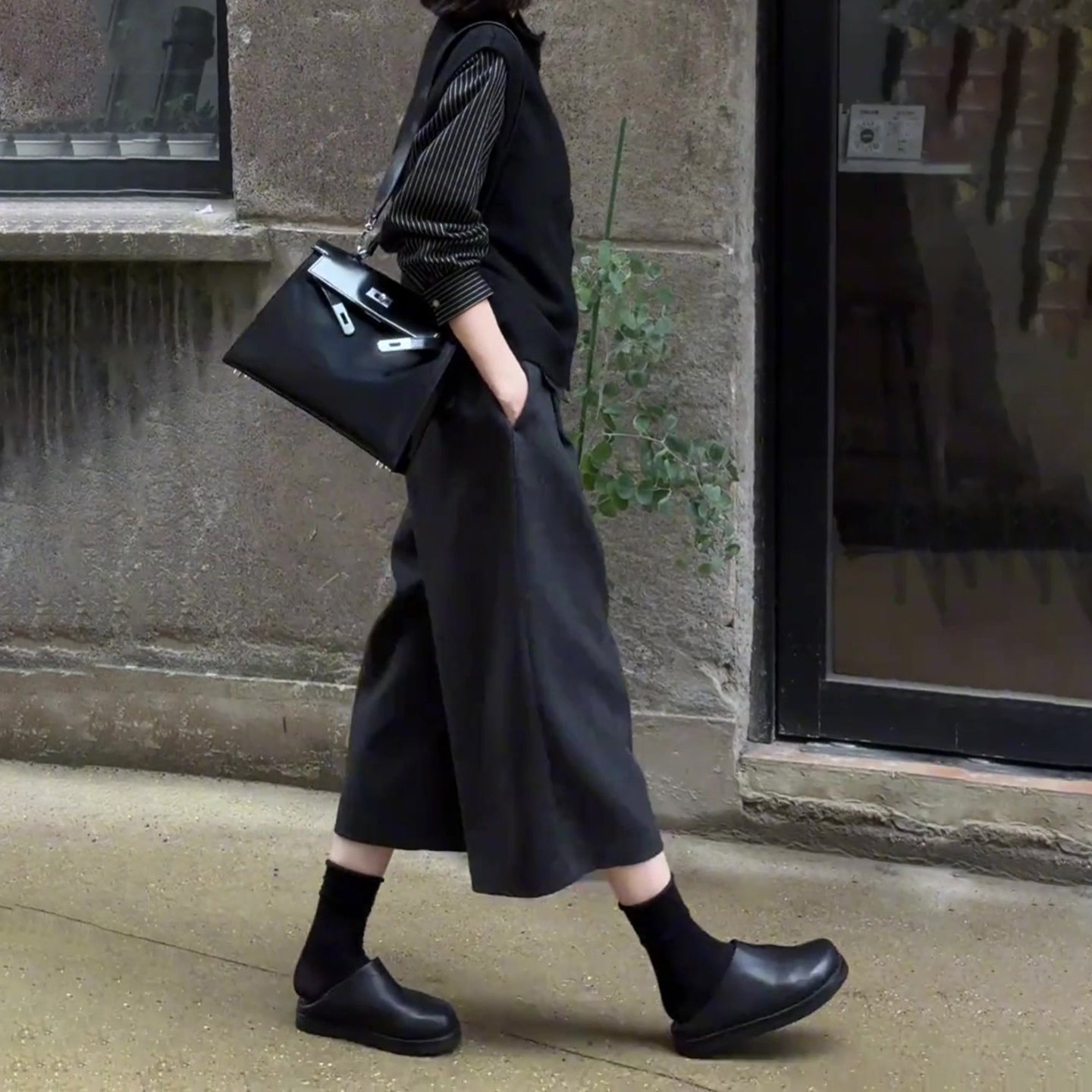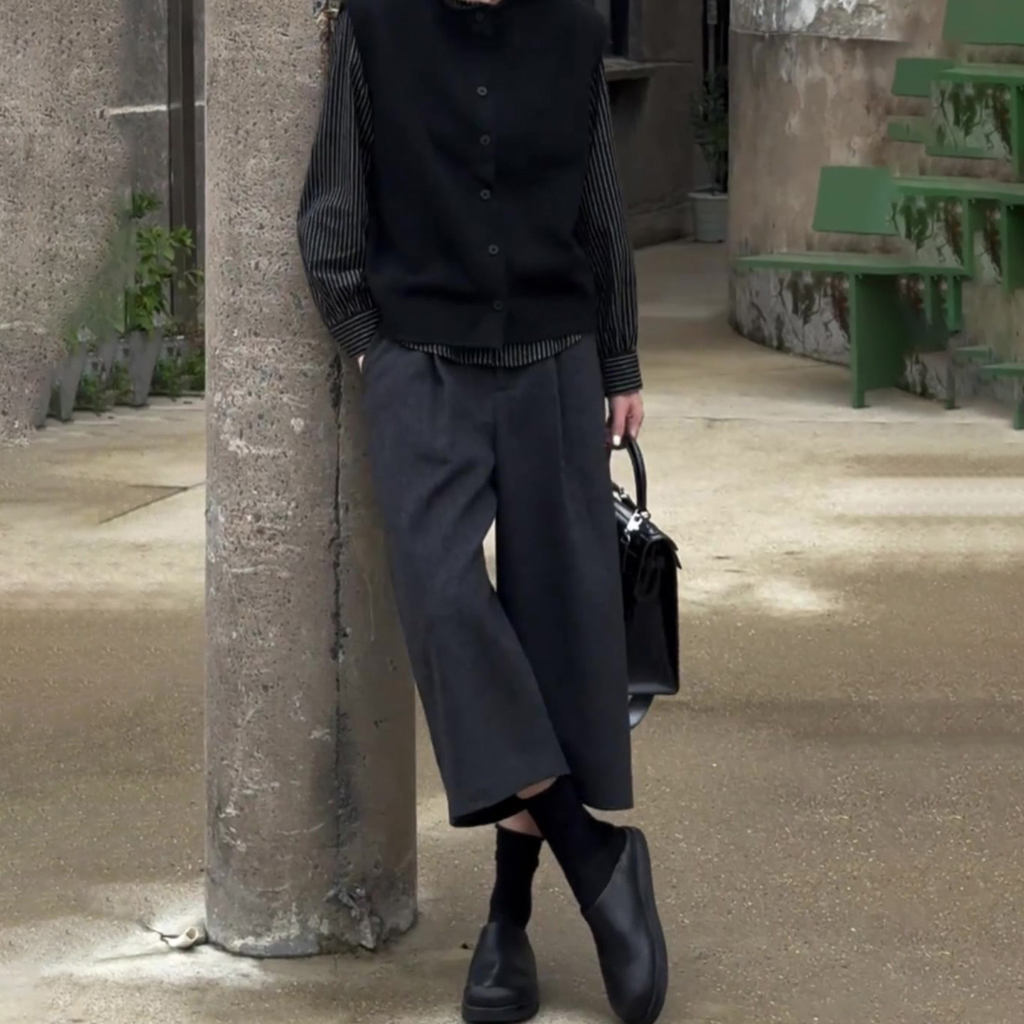 灰色压褶休闲七分毛呢裤女2025秋季流行新款高腰宽松时尚阔腿裤子