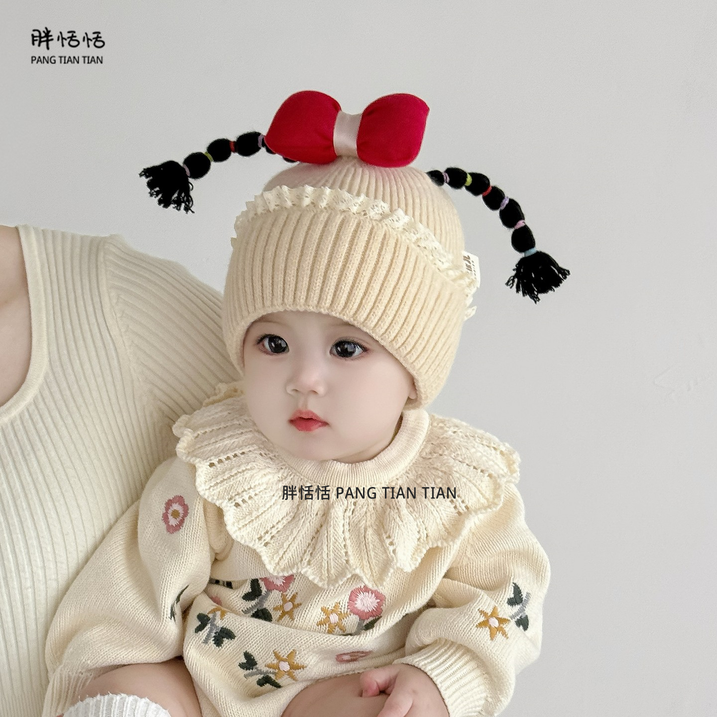 女宝宝帽子秋冬季可爱洋气小月龄假发辫子帽婴幼儿加厚保暖毛线帽