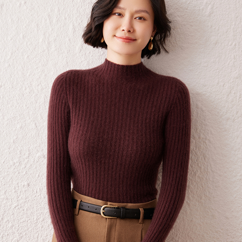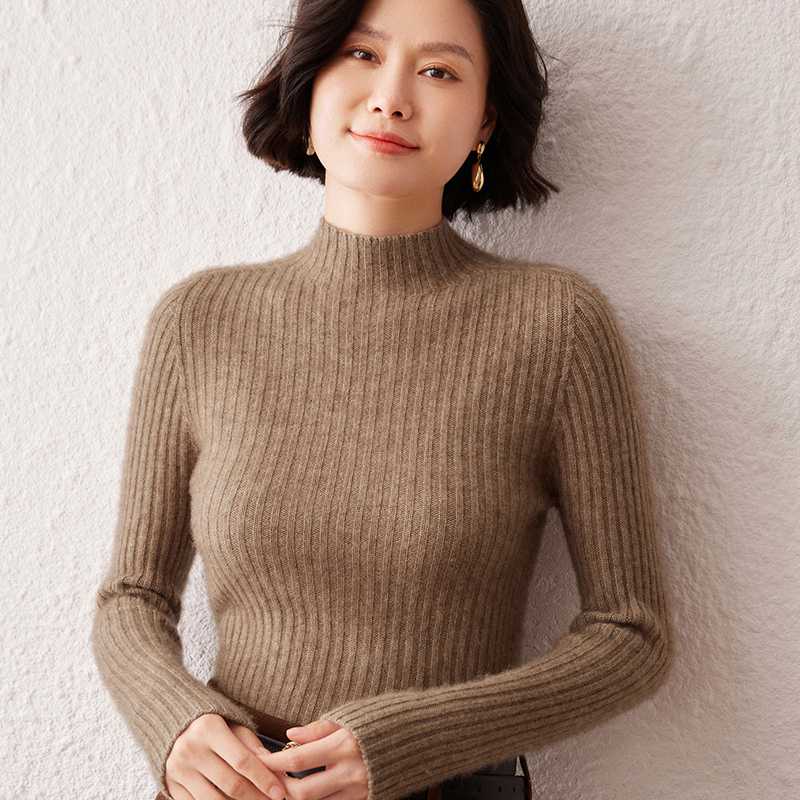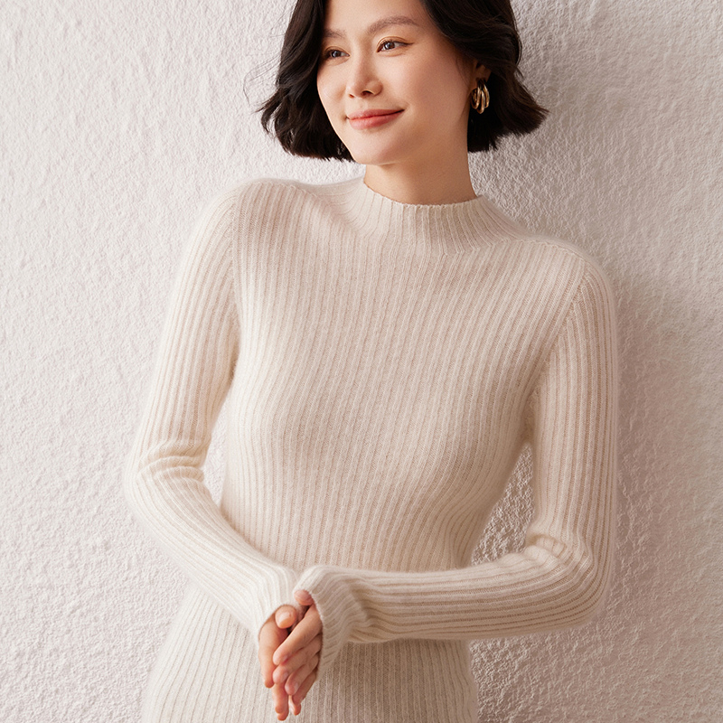 秋冬新款纯山羊绒衫女半高领修身毛衣无缝坑条时尚显瘦针织打底衫