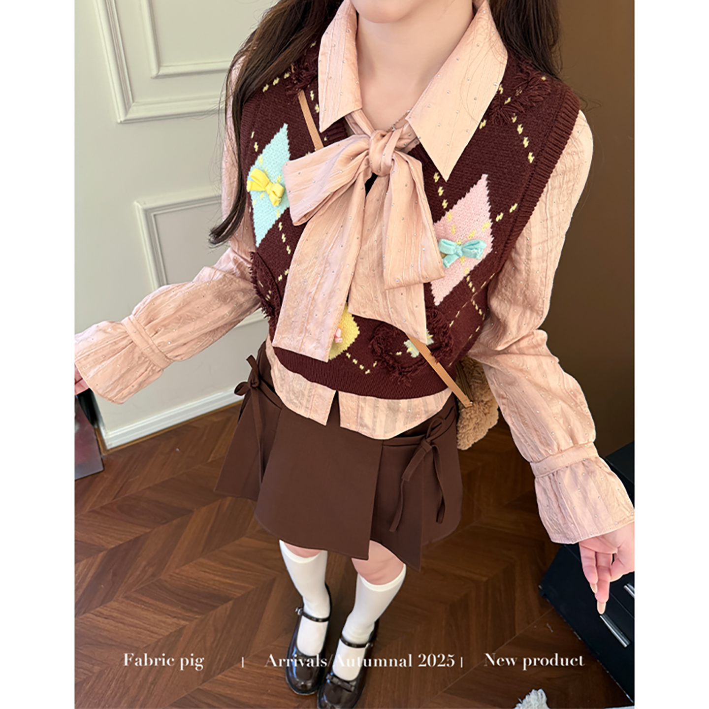 织物猪 风琴蓝调 学院风套装女秋粉色衬衫针织马甲背心短裙三件套