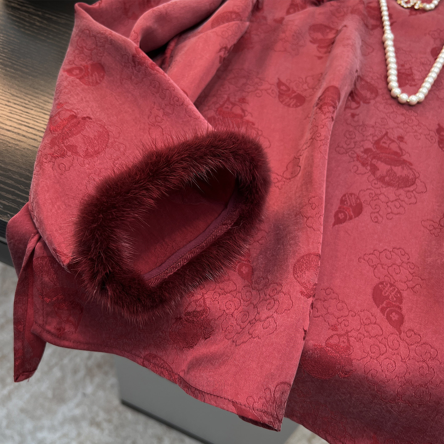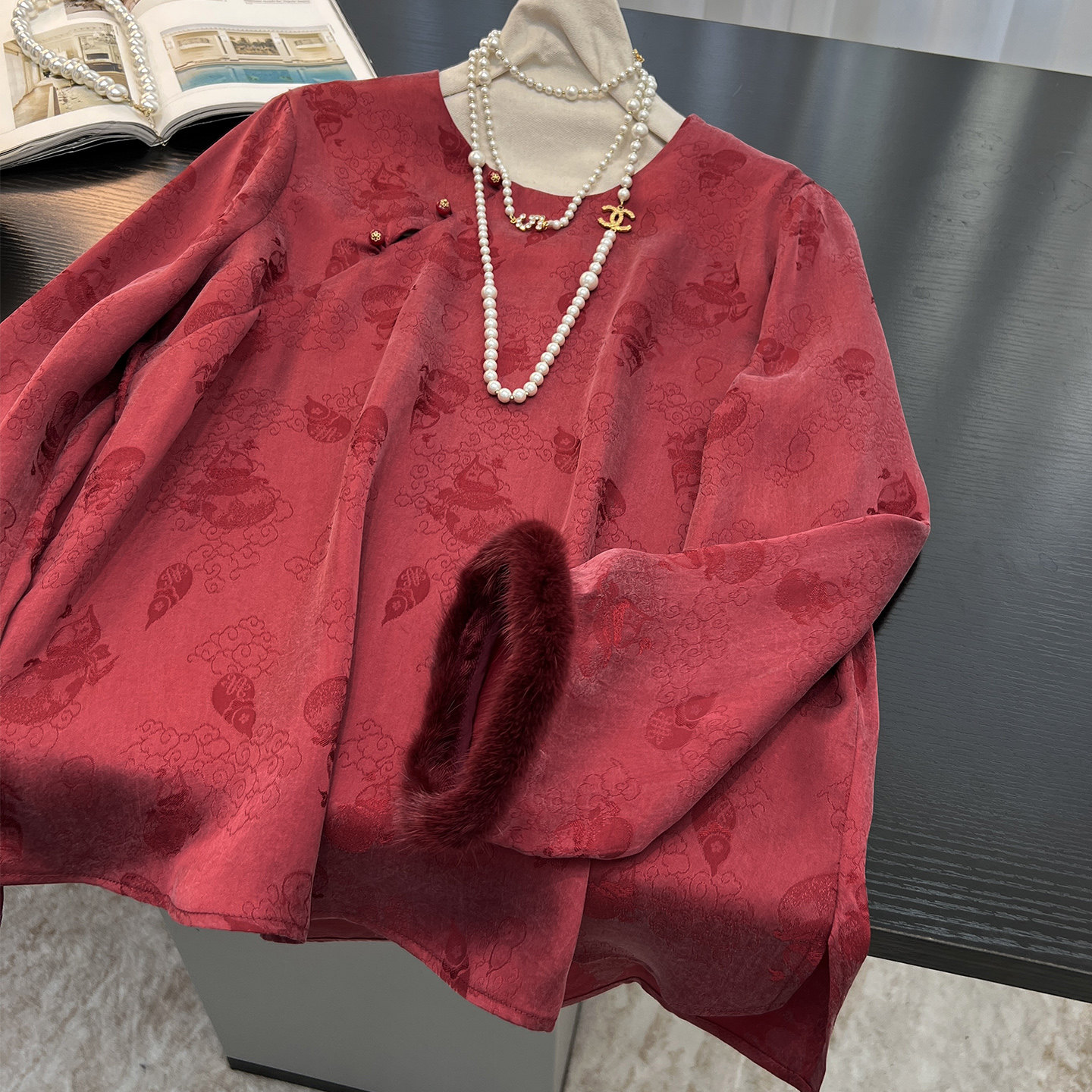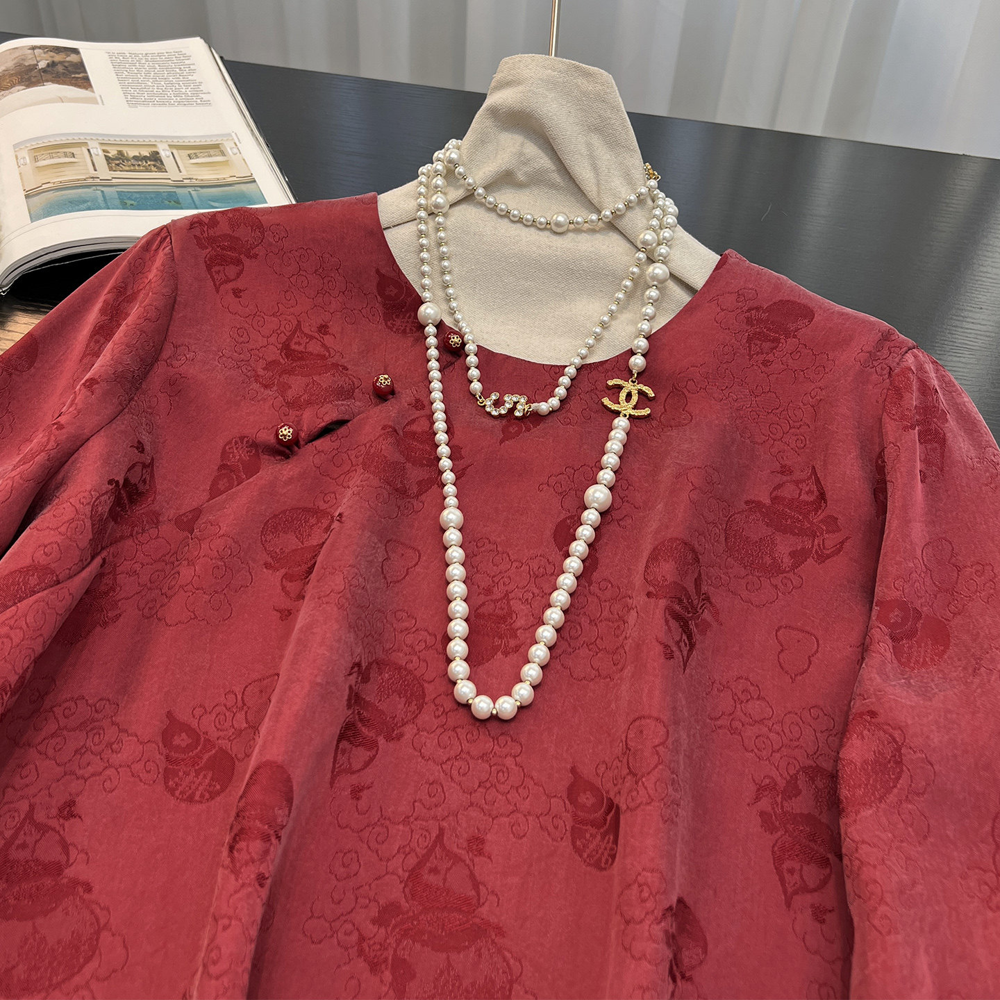 新中式风真丝提花衬衫女装2026早春季新款长袖酒红色拼接气质上衣