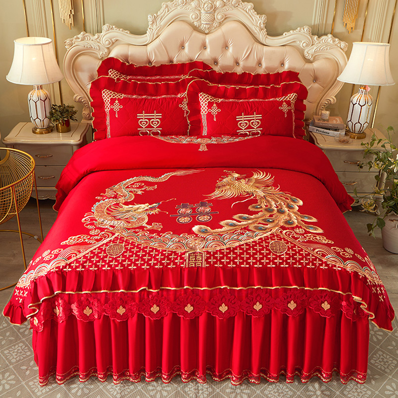 中式婚嫁b全棉婚庆大红四件套床裙款刺绣花喜被套结婚床上用品