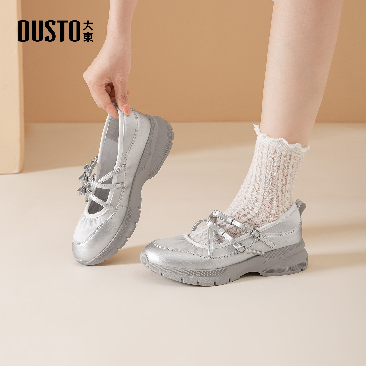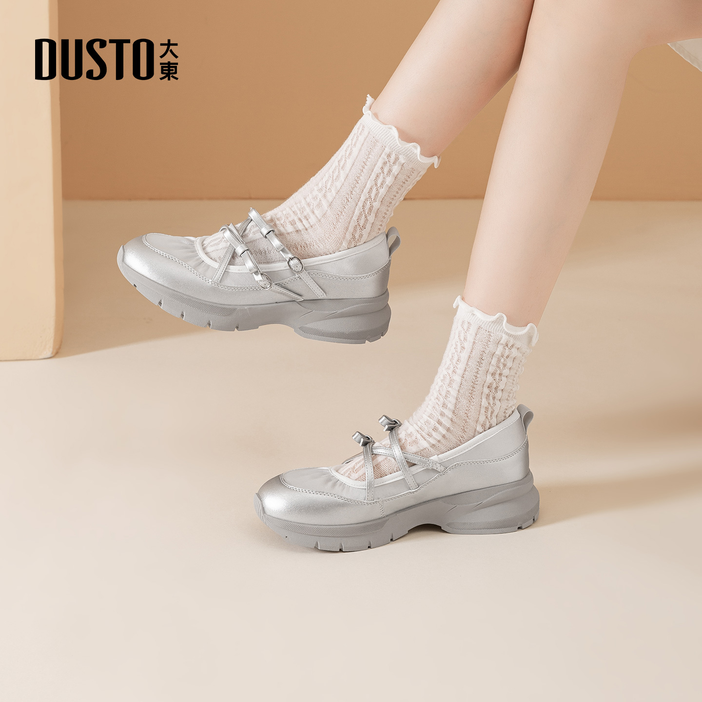 大东玛丽珍鞋女鞋2026春季新款舒适平底中跟套脚圆头蝴蝶结C0350