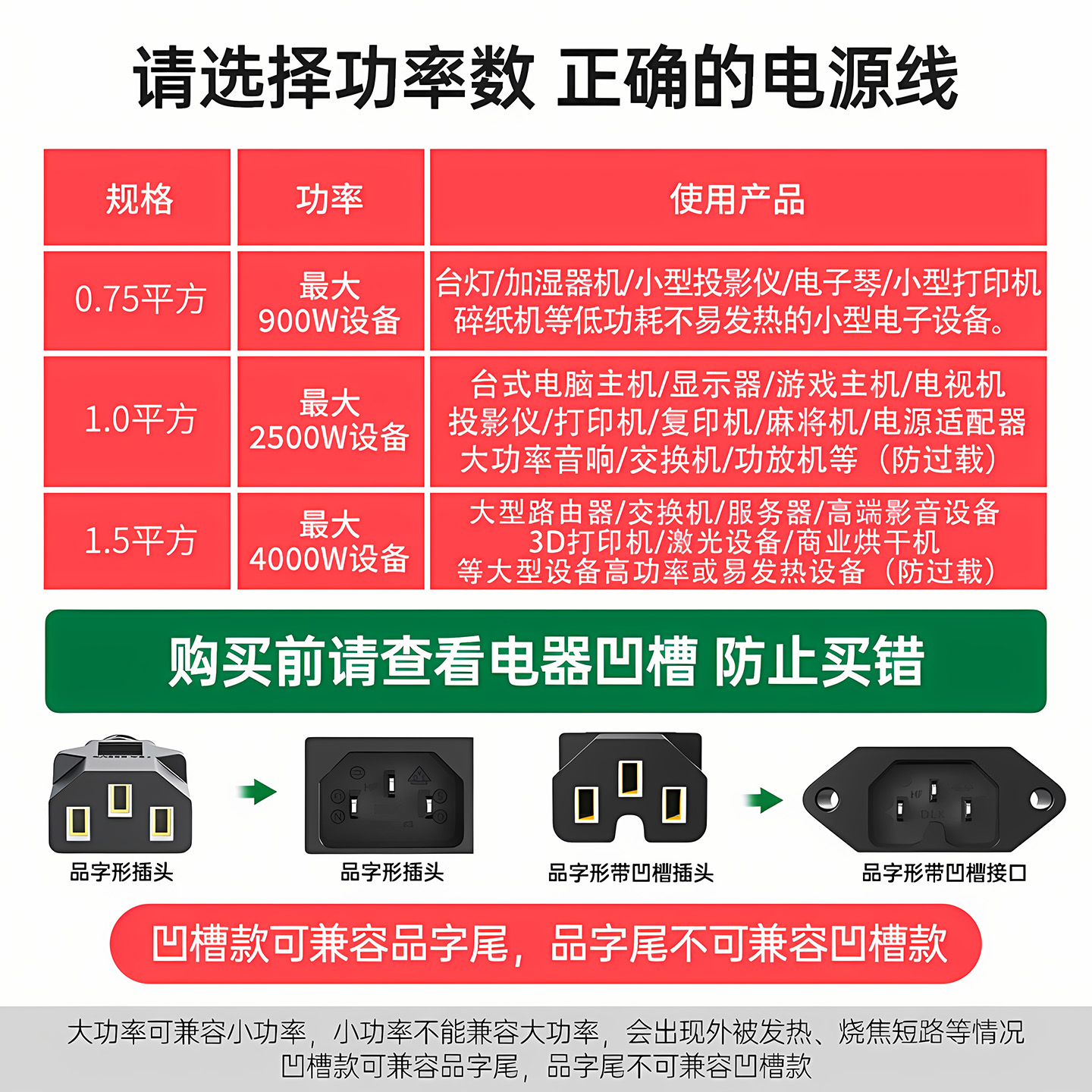 台式电脑主机箱显示器三孔电源线打印机投影仪液晶电视机品字插头