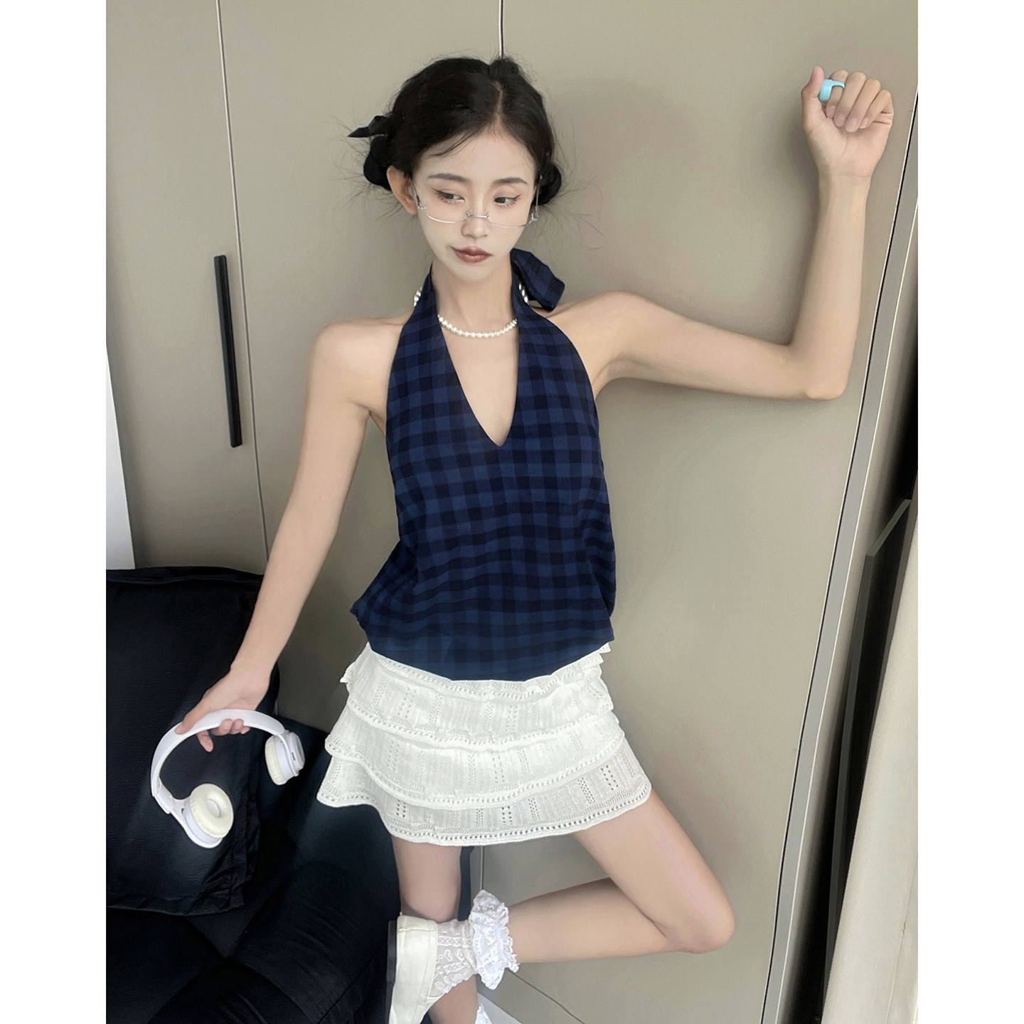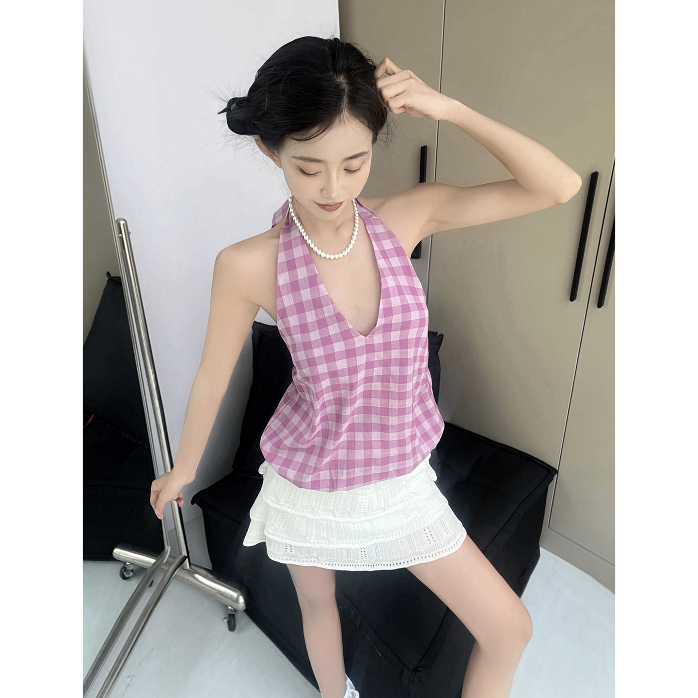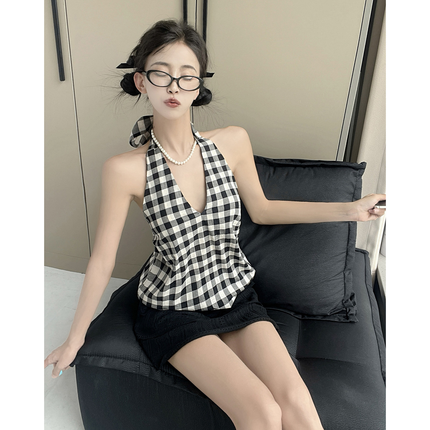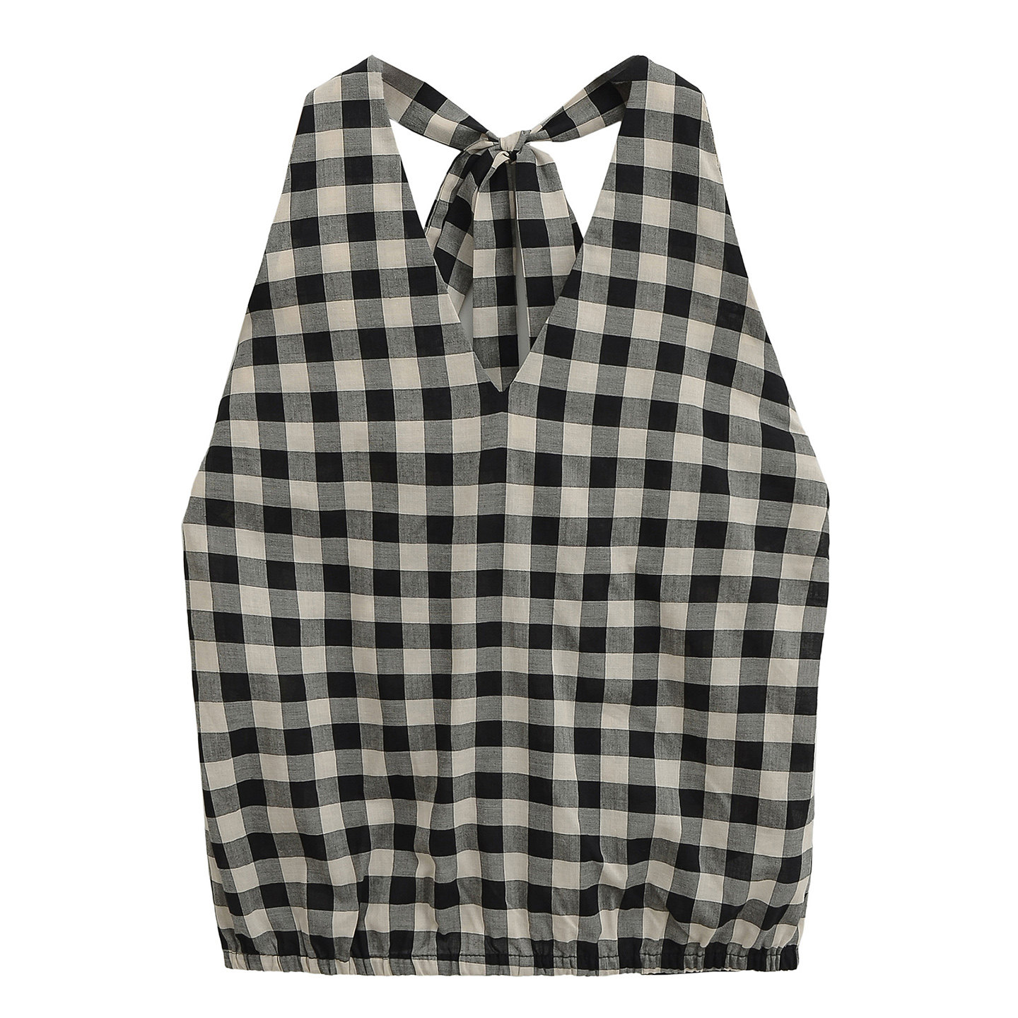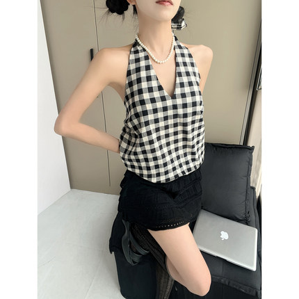 MianCun简约格纹挂脖吊带背心女夏外穿修身短款无袖系带露背上衣