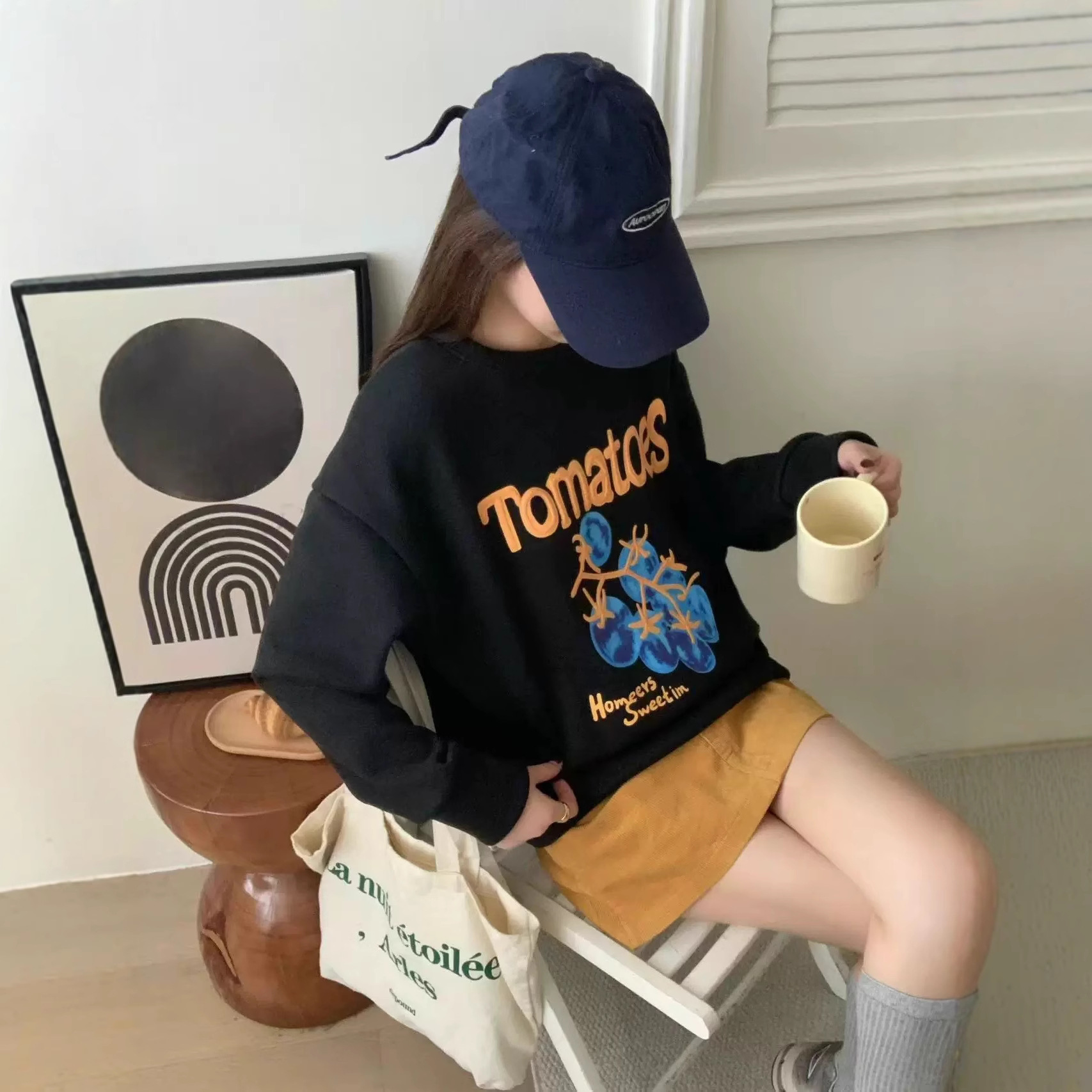 韩系东大门番茄字母刺绣印花卫衣2025冬季加绒套头圆领上衣女
