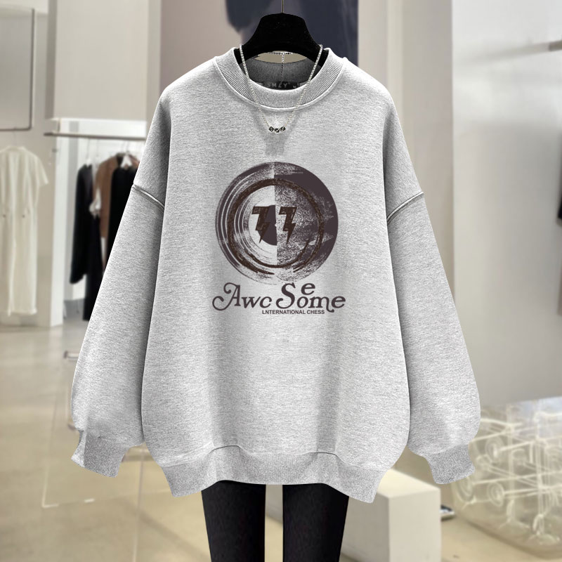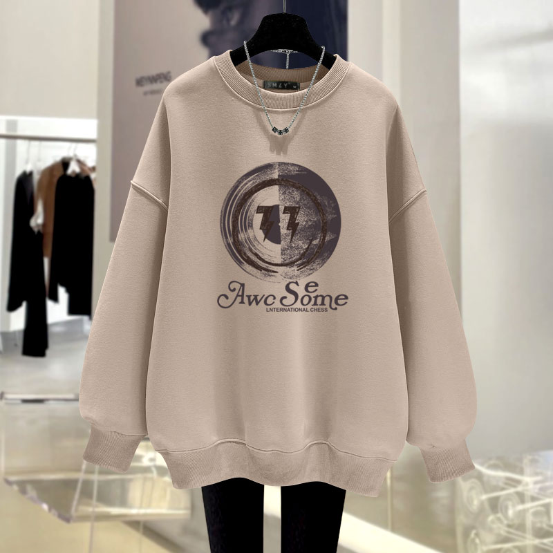 2025春秋冬季设计感印花字母中长款加绒加厚宽松套头圆领卫衣女潮