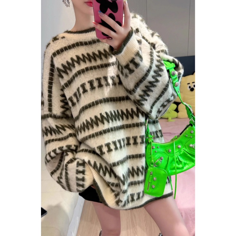 撞色条纹套头毛衣女2025新款秋冬季加厚保暖宽松慵懒风针织衫上衣