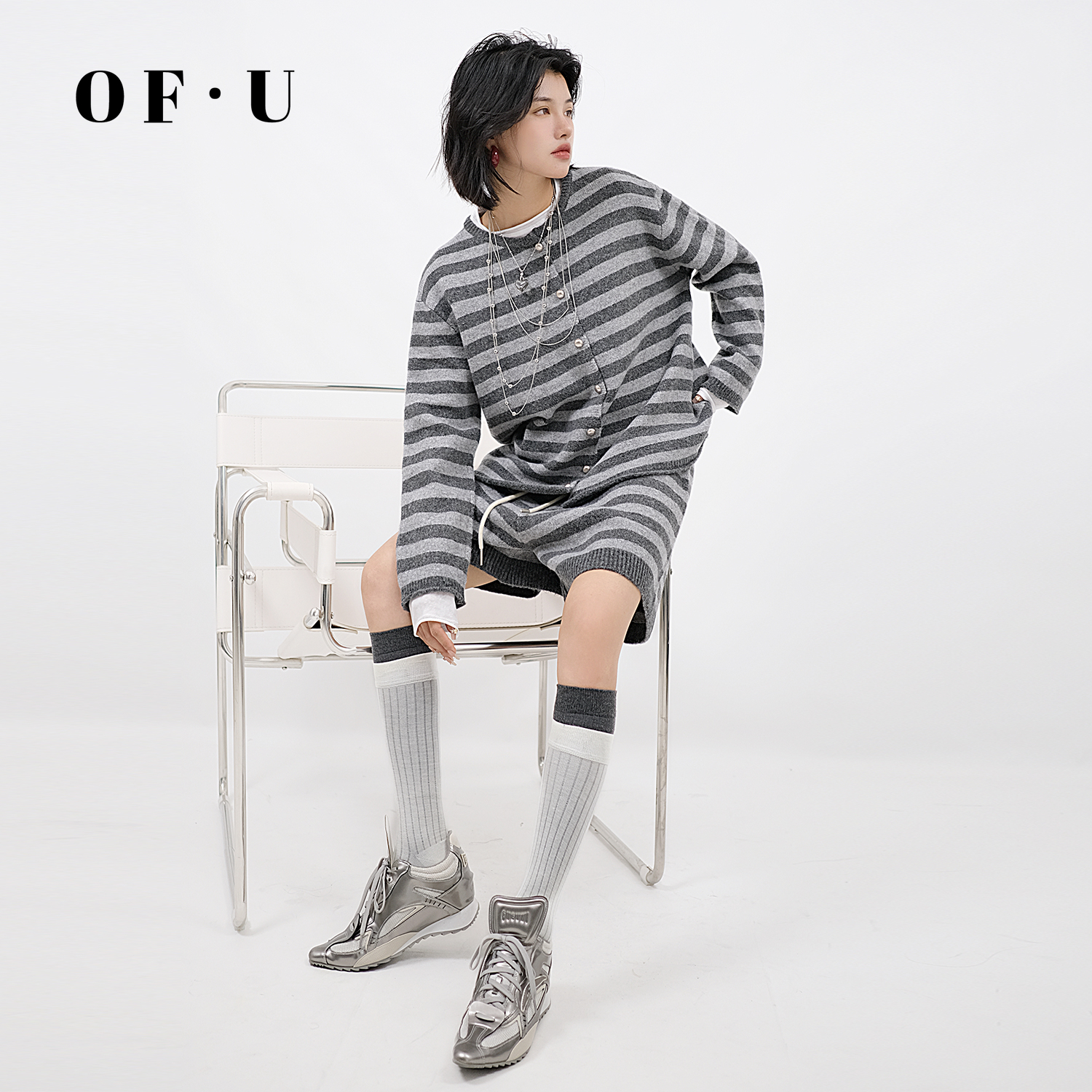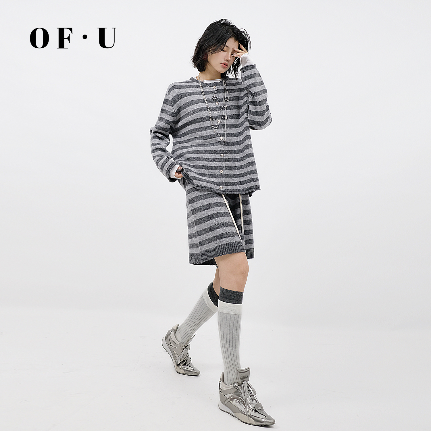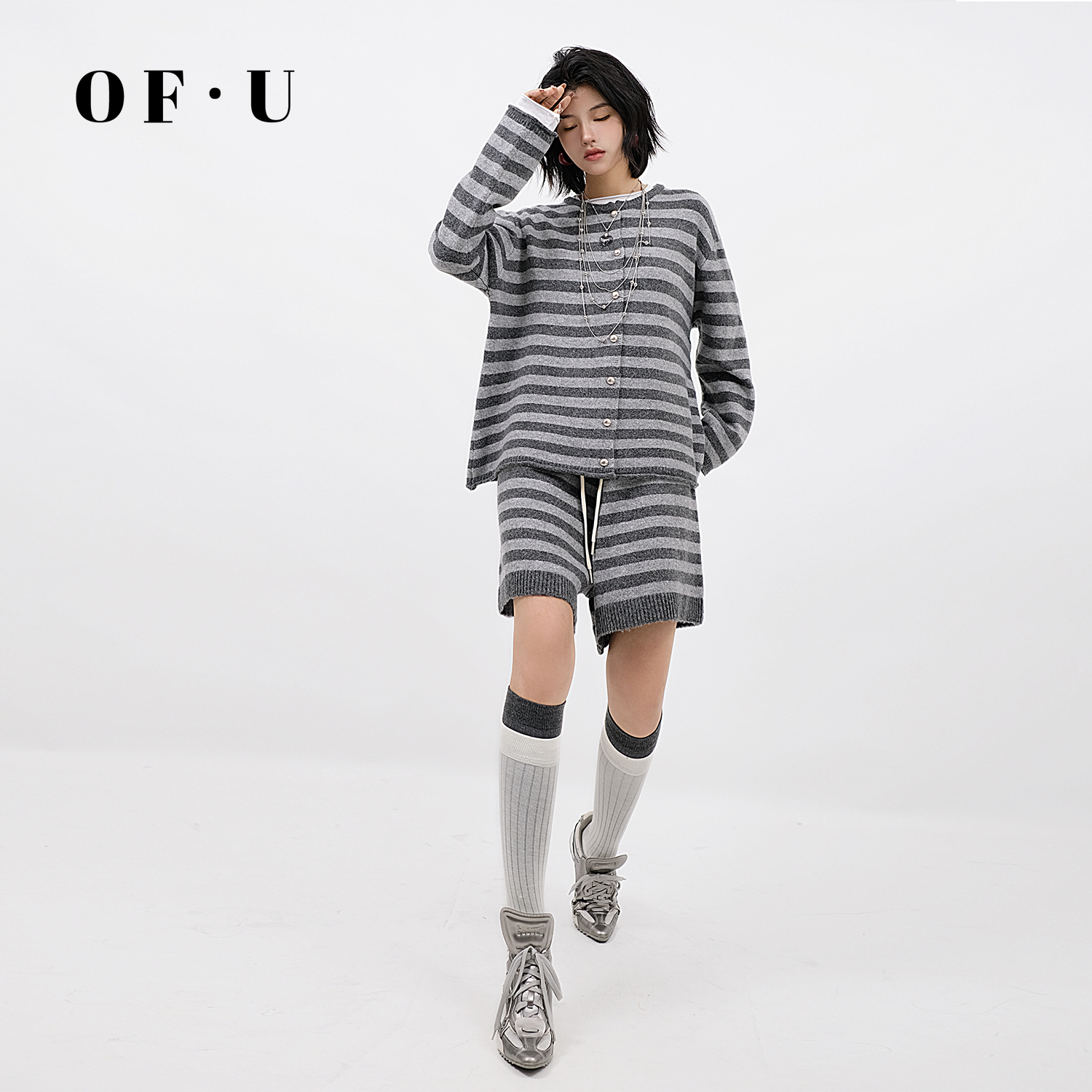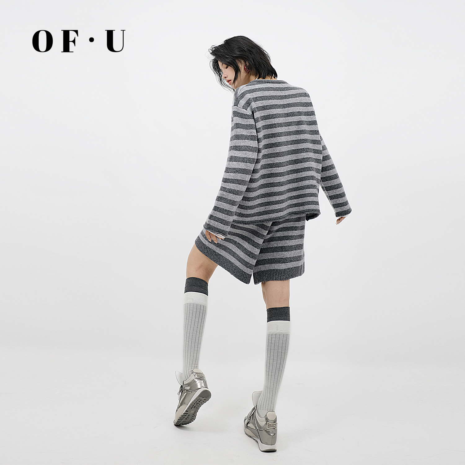 OF U慵懒风撞色条纹针织开衫短裤两件套女秋冬宽松松弛感毛衣套装