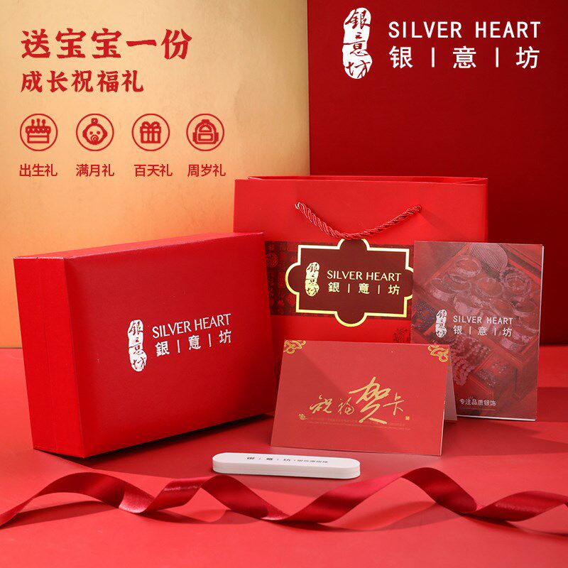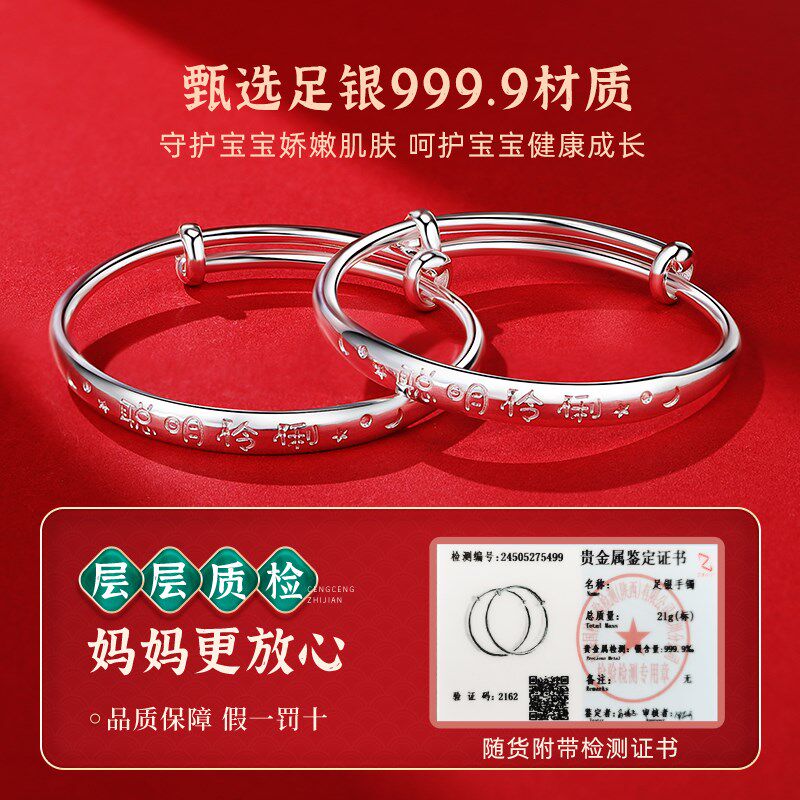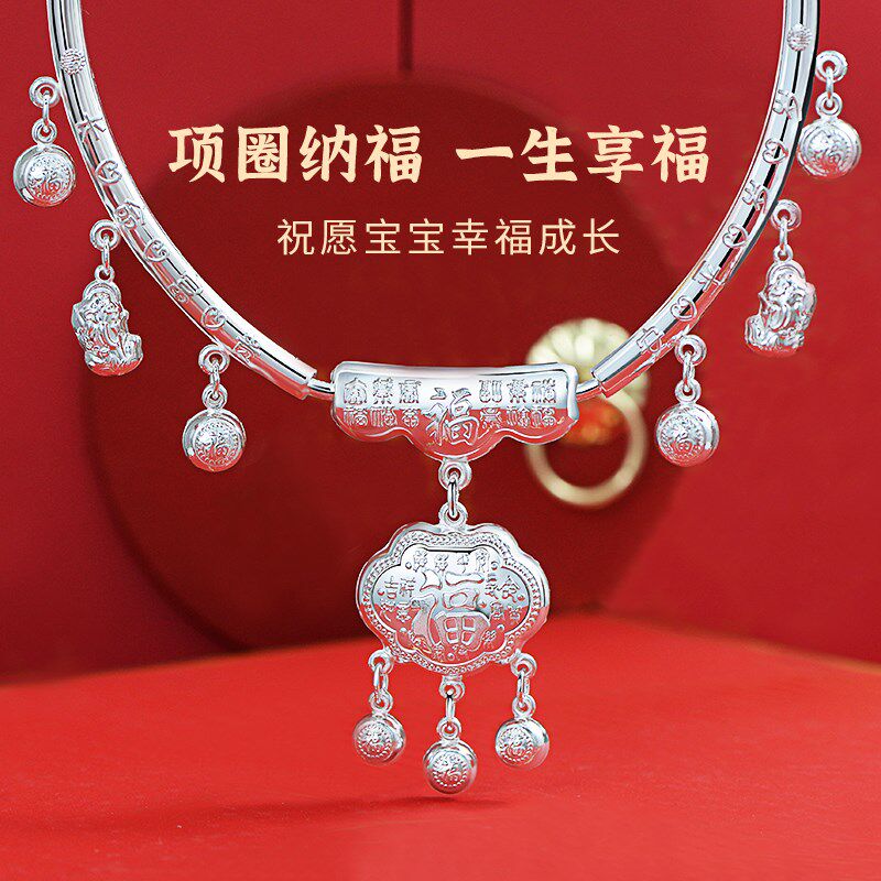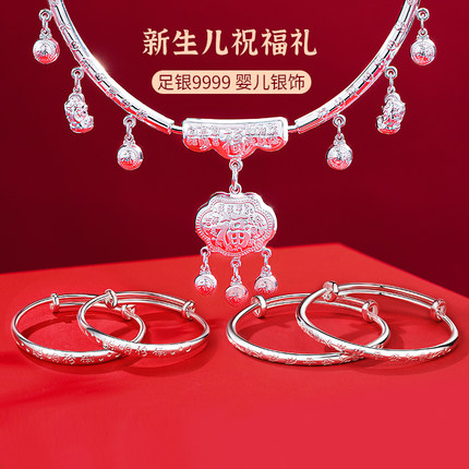 宝宝银项圈银手镯长命锁纯银9999银锁婴儿银饰五件套满月周岁礼物