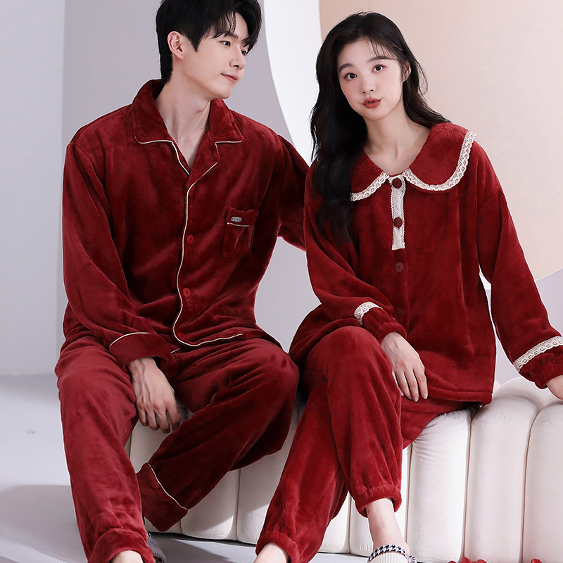 思馨坊结婚情侣睡衣秋冬季珊瑚绒加厚加绒红色本命年男女士家居服