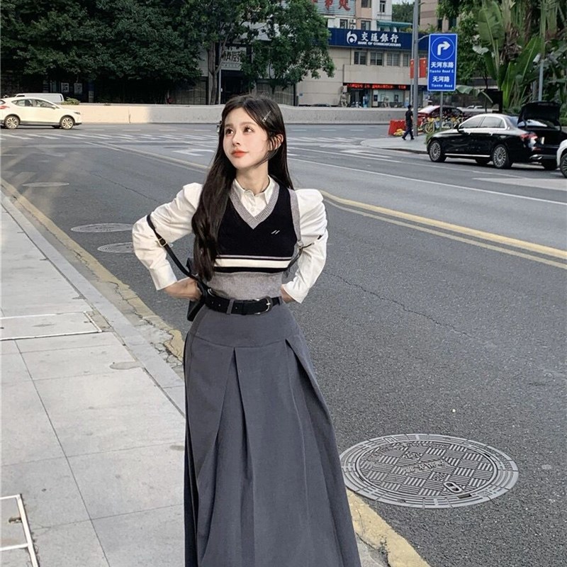 时尚套装女秋季短款针织马甲背心叠穿衬衫西装百褶裙一整套学院风