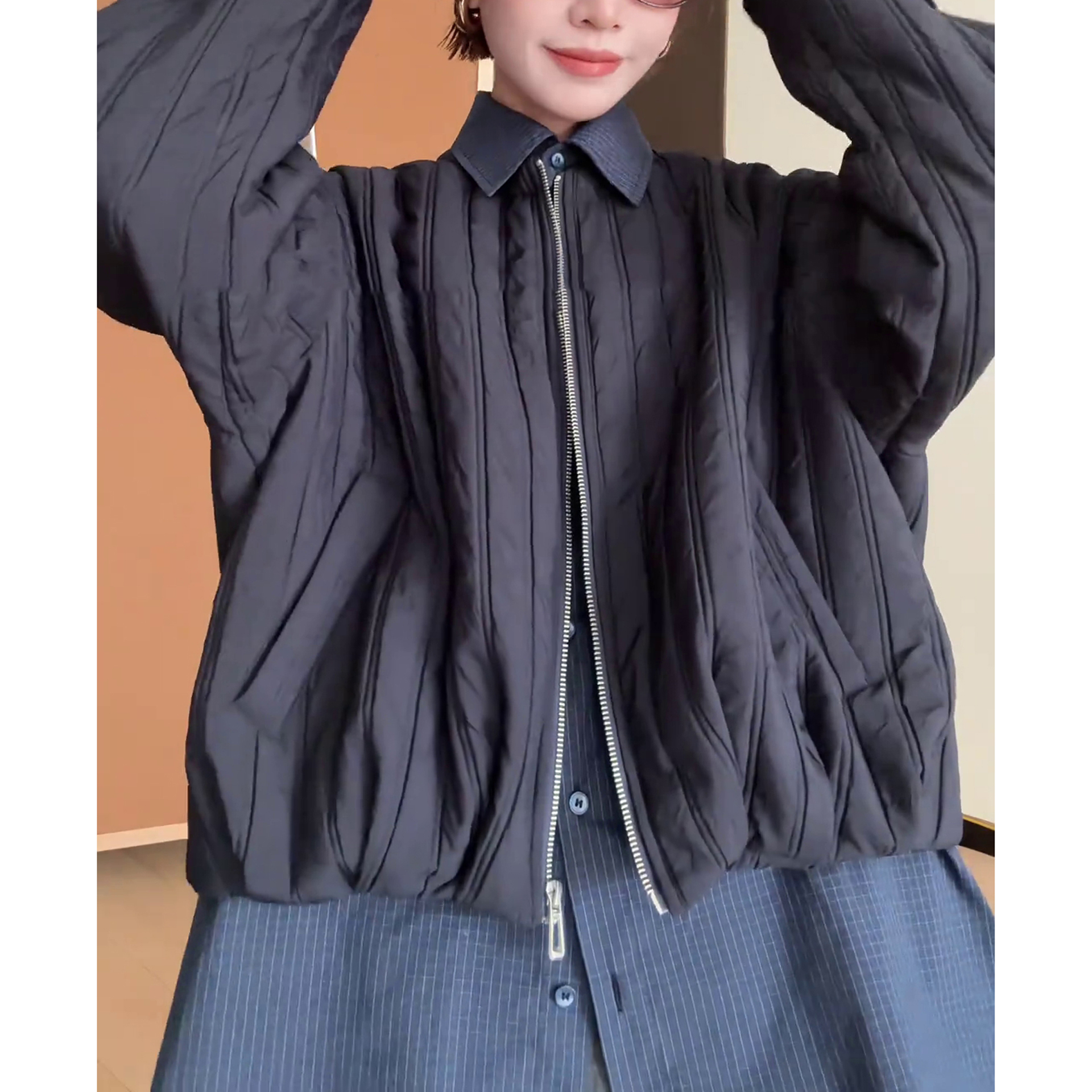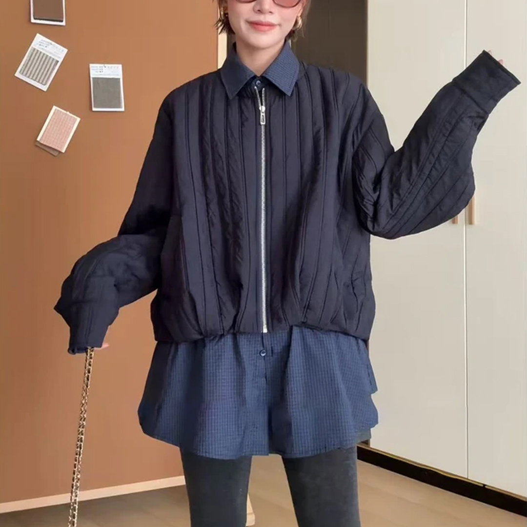 秋季新款拼接格子假两件休闲棉衣
