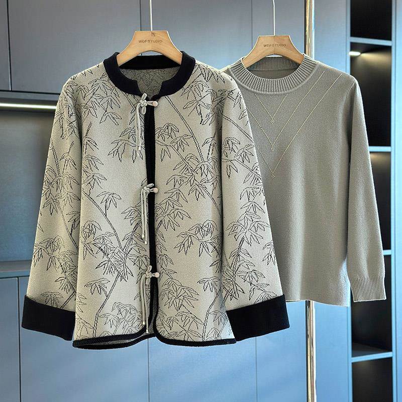 中国风妈妈装针织衫两件套女春秋新款上衣气质时尚中老年毛衣套装