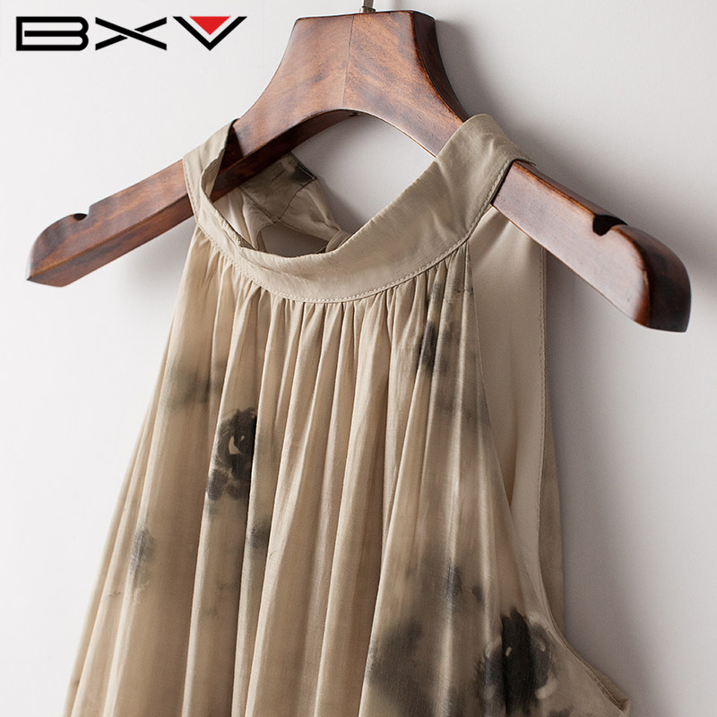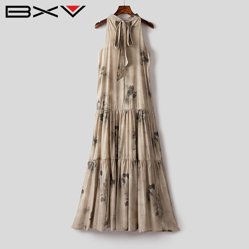 BXV印花挂脖连衣裙女中长款2025夏季新款碎花长裙无袖复古裙子潮