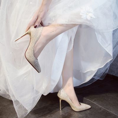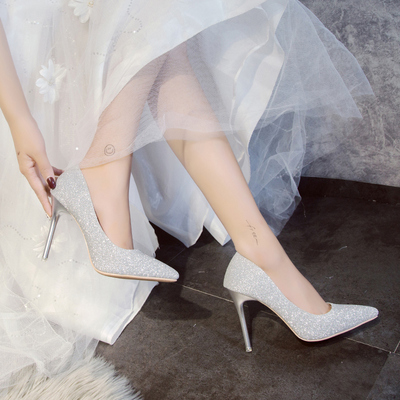 浅色高跟鞋女细跟ins仙网红尖头气质礼服婚纱照银色百搭伴娘单鞋