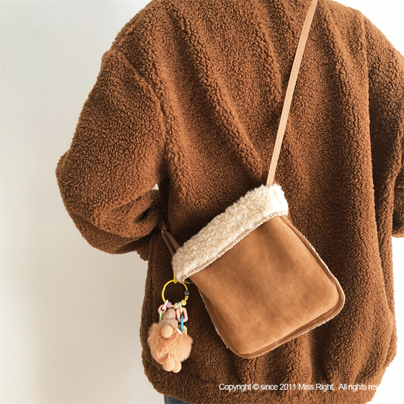 韩系仿鹿皮绒羊羔毛斜挎水桶小包